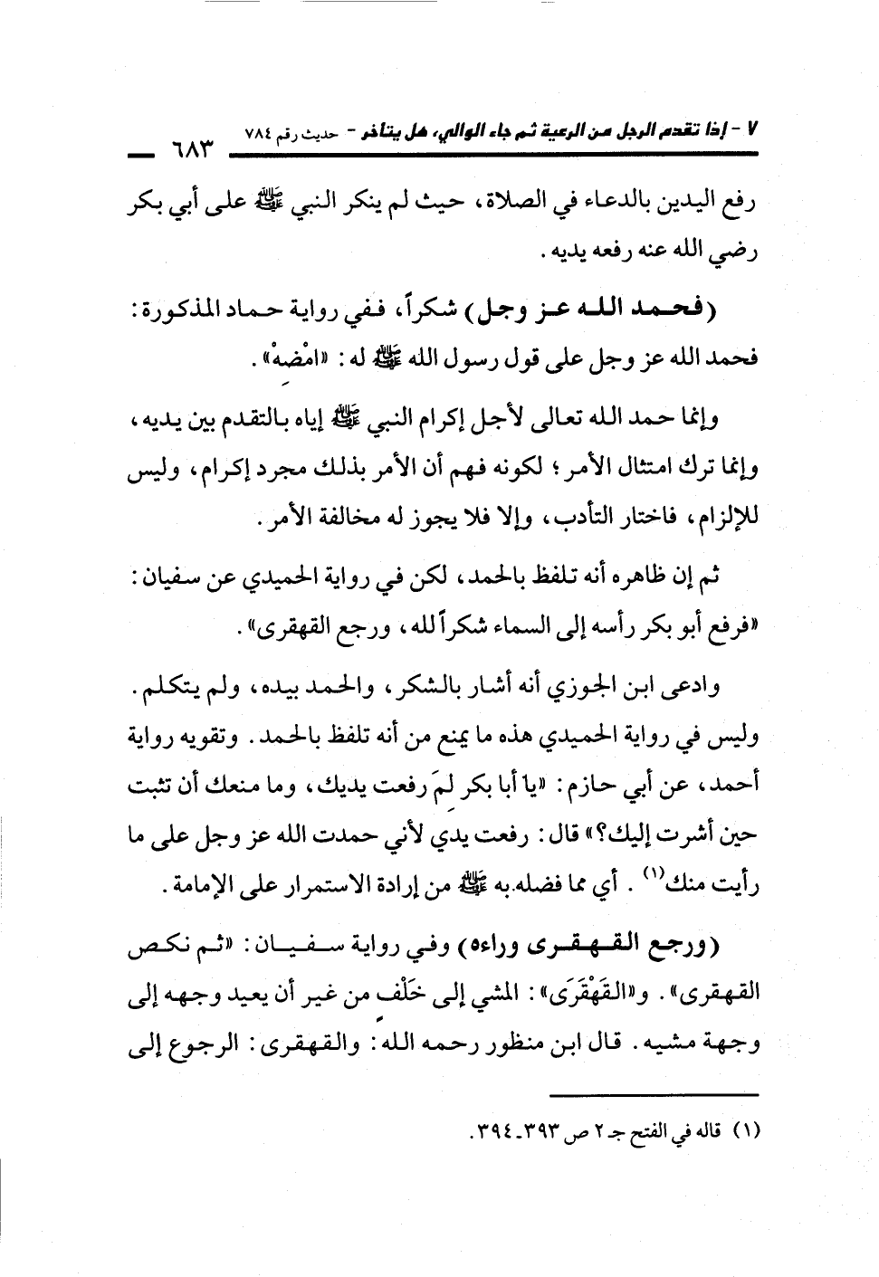ثم إن ظاهره أنه تلفظ بالحمد، لكن في رواية الحميدي عن سفيان: "فرفع أبو بكر رأسه إلى السماء شكراً لله، ورجع القهقرى".