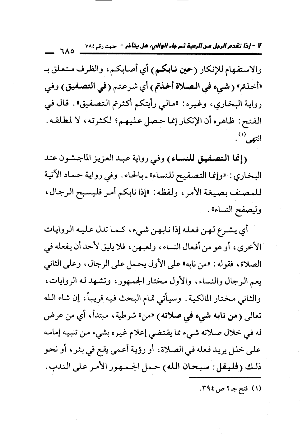 أي يشرع لهن فعله إذا نابهن شيء، كما تدل عليه الروايات الأخرى، أو هو من أفعال النساء، ولعبهن، فلا يليق لأحد أن يفعله في الصلاة، فقوله: "من نابه" على الأول يحمل على الرجال، وعلى الثاني يعم الرجال والنساء، والأول مختار الجمهور، وتشهد له الروايات، والثاني مختار المالكية. وسيأتي تمام البحث فيه قريباً، إن شاء الله تعالى (من نابه شيء في صلاته) "من" شرطية، مبتدأ، أي من عرض له في خلال صلاته شيء مما يقتضي إعلام غيره بشيء من تنبيه إمامه على خلل يريد فعله في الصلاة، أو رؤية أعمى يقع في بئر، أو نحو ذلك (فليقل: سبحان الله) حمل الجمهور الأمر على الندب.