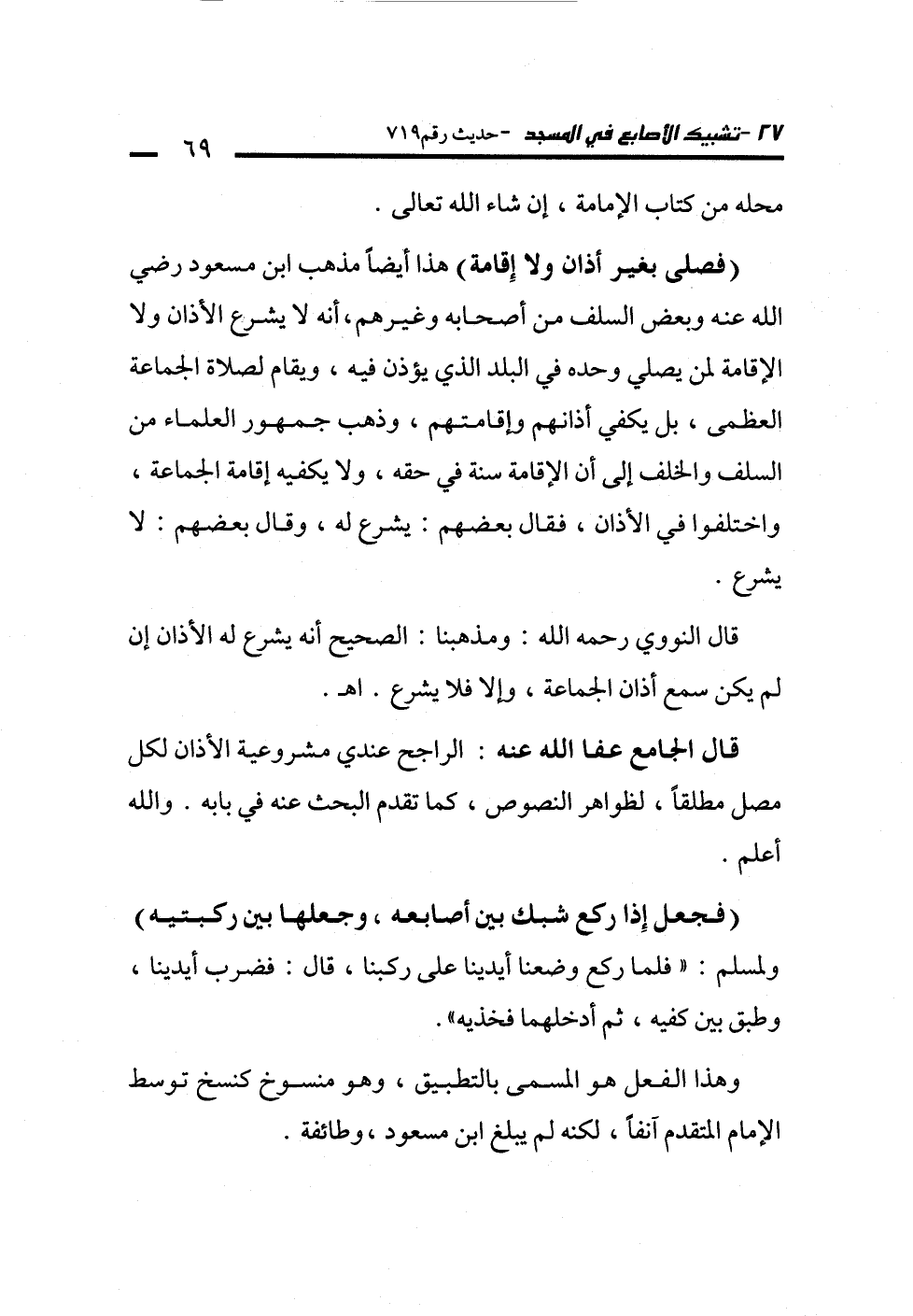 وهذا الفعل هو المسمى بالتطبيق، وهو منسوخ كنسخ توسط الإِمام المتقدم آنفاً، لكنه لم يبلغ ابن مسعود، وطائفة.