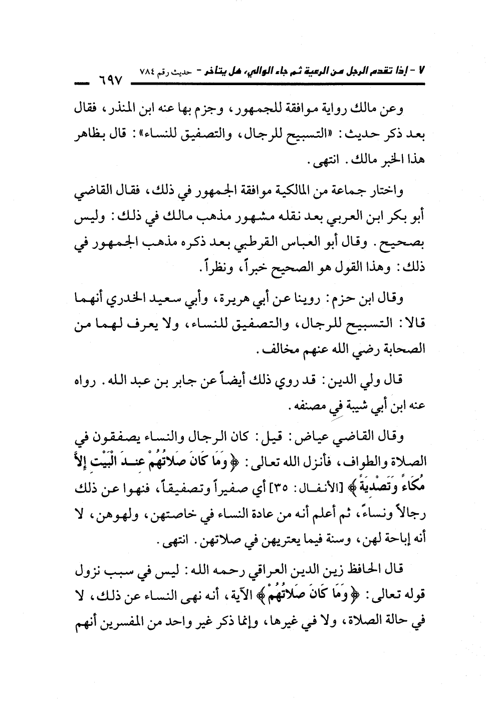 وعن مالك رواية موافقة للجمهور، وجزم بها عنه ابن المنذر، فقال بعد ذكر حديث: "التسبيح للرجال، والتصفيق للنساء": قال بظاهر هذا الخبر مالك. انتهى.
