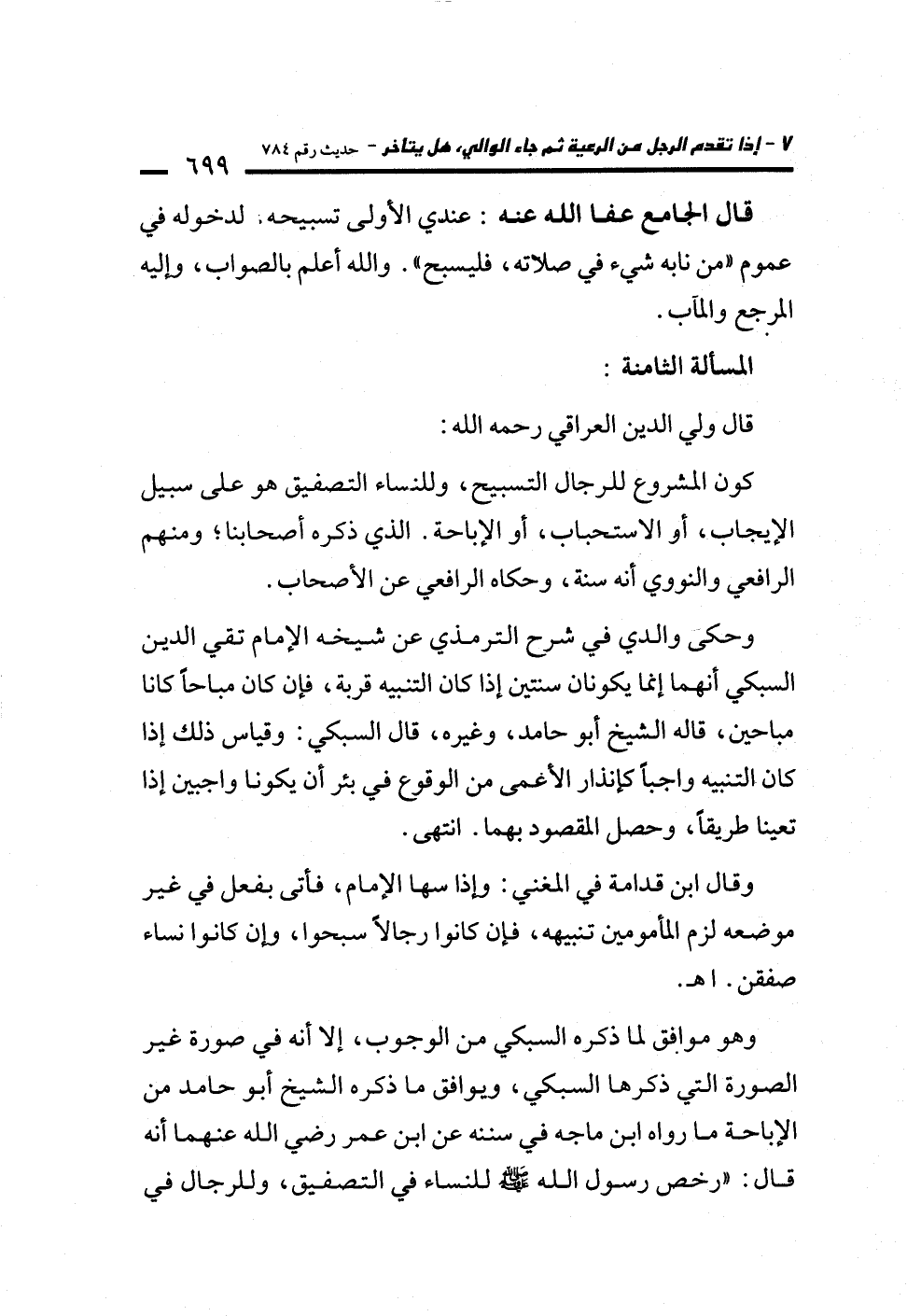 وقال ابن قدامة في المغني: وإذا سها الإمام، فأتى بفعل في غير موضعه لزم المأمومين تنبيهه، فإن كانوا رجالاً سبحوا، وإن كانوا نساء صفقن. اهـ.