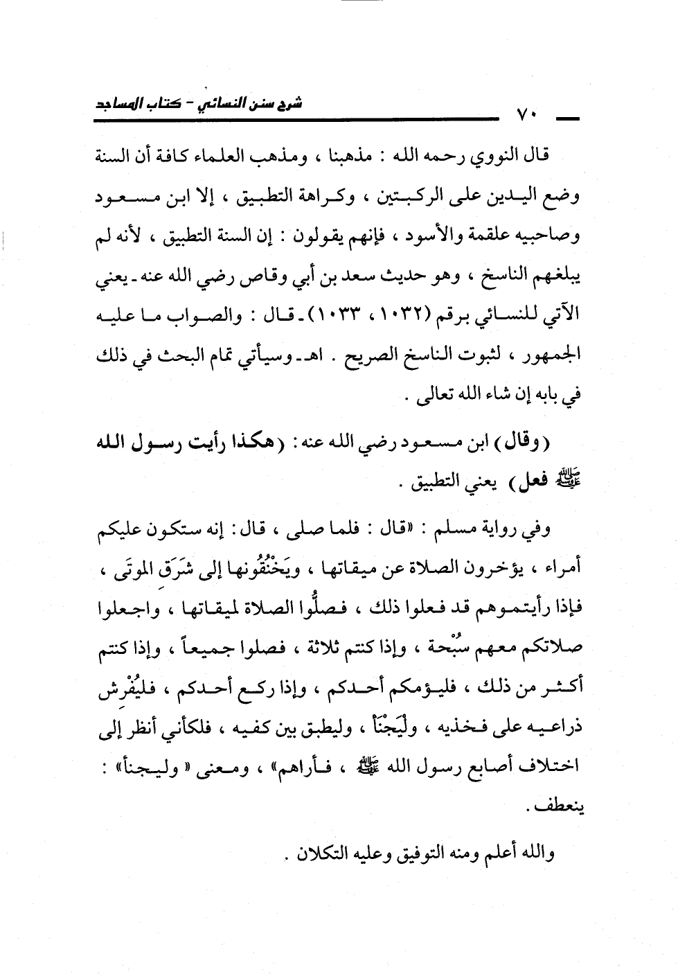 قال النووي رحمه الله: مذهبنا، ومذهب العلماء كافة أن السنة وضع اليدين على الركبتين، وكراهة التطبيق، إلا ابن مسعود وصاحبيه علقمة والأسود، فإنهم يقولون: إن السنة التطبيق؛ لأنه لم يبلغهم الناسخ، وهو حديث سعد بن أبي وقاص رضي الله عنه -يعني الآتي للنسائي برقم (1032، 1033) - قال: والصواب ما عليه الجمهور، لثبوت الناسخ الصريح. اهـ - وسيأتي تمام البحث في ذلك في بابه إن شاء الله تعالى.