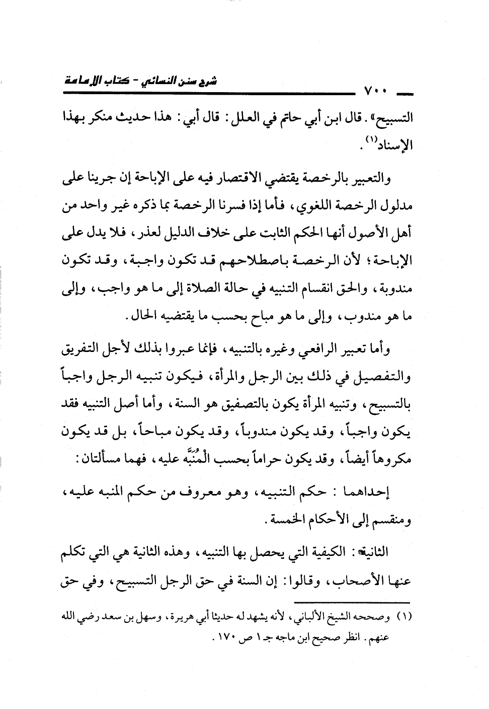 والتعبير بالرخصة يقتضي الاقتصار فيه على الإباحة إن جرينا على مدلول الرخصة اللغوي، فأما إذا فسرنا الرخصة بما ذكره غير واحد من أهل الأصول أنها الحكم الثابت على خلاف الدليل لعذر، فلا يدل على الإباحة؛ لأن الرخصة باصطلاحهم قد تكون واجبة، وقد تكون مندوبة، والحق انقسام التنبيه في حالة الصلاة إلى ما هو واجب، وإلى ما هو مندوب، وإلى ما هو مباح بحسب ما يقتضيه الحال.