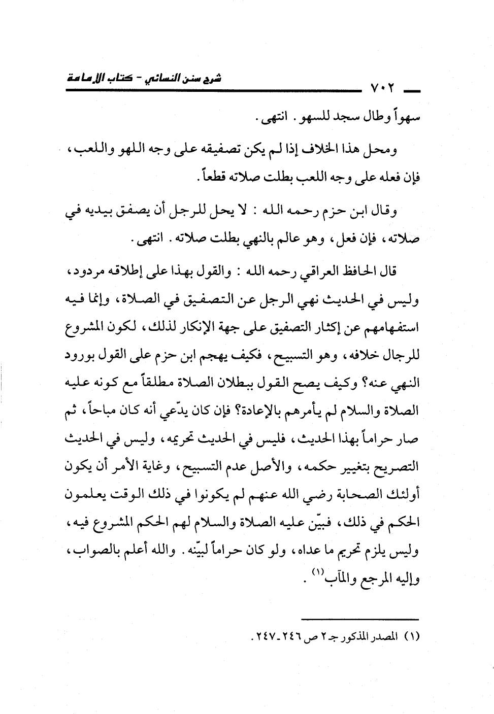 قال الحافظ العراقي رحمه الله: والقول بهذا على إطلاقه مردود، وليس في الحديث نهي الرجل عن التصفيق في الصلاة، وإنما فيه استفهامهم عن إكثار التصفيق على جهة الإنكار لذلك، لكون المشروع للرجال خلافه، وهو التسبيح، فكيف يهجم ابن حزم على القول بورود النهي عنه؟ وكيف يصح القول ببطلان الصلاة مطلقاً مع كونه عليه الصلاة والسلام لم يأمرهم بالإعادة؟ فإن كان يدّعي أنه كان مباحاً، ثم صار حراماً بهذا الحديث، فليس في الحديث تحريمه، وليس في الحديث التصريح بتغيير حكمه، والأصل عدم التسبيح، وغاية الأمر أن يكون أولئك الصحابة رضي الله عنهم لم يكونوا في ذلك الوقت يعلمون الحكم في ذلك، فبيّن عليه الصلاة والسلام لهم الحكم المشروع فيه، وليس يلزم تحريم ما عداه، ولو كان حراماً لبيّنه. والله أعلم بالصواب، وإليه المرجع والمآب (¬1).