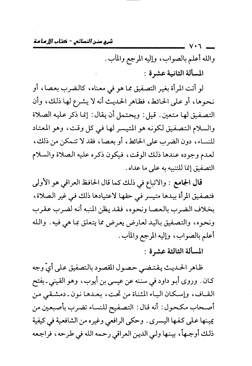 قال الجامع: والاتباع في ذلك كما قال الحافظ العراقي هو الأولى فتصفيق المرأة بيدها متيسر في حقها لاعتيادها ذلك في غير الصلاة، بخلاف الضرب بالعصا ونحوه، فقد يظن المنبه أنه لضرب عقرب ونحوه، والتصفيق باليد لعارض يعرض مما يتعلق بما هي فيه. والله أعلم بالصواب، وإليه المرجع والمآب.