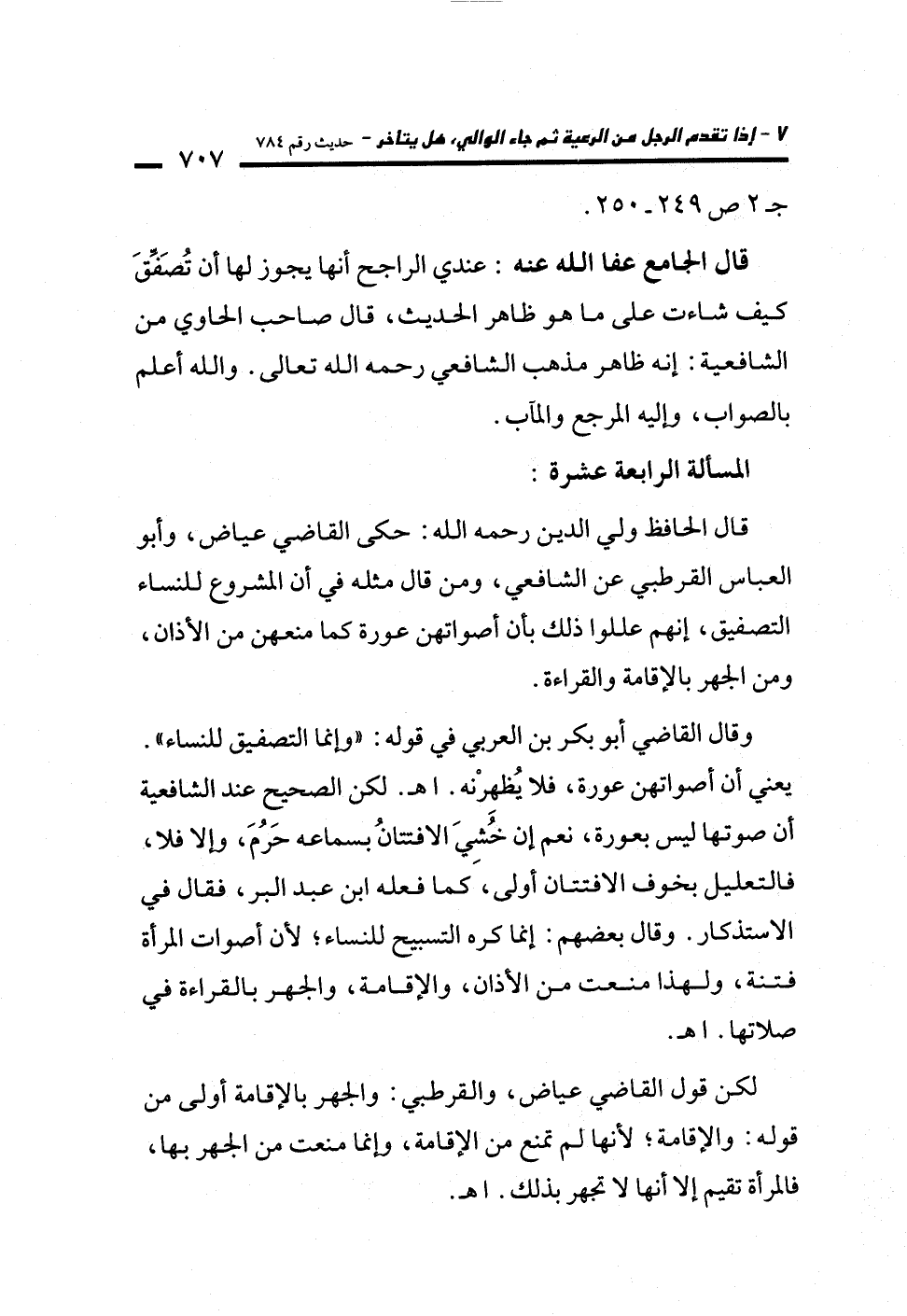 قال الحافظ ولي الدين رحمه الله: حكى القاضي عياض، وأبو العباس القرطبي عن الشافعي، ومن قال مثله في أن المشروع للنساء التصفيق، إنهم عللوا ذلك بأن أصواتهن عورة كما منعهن من الأذان، ومن الجهر بالإقامة والقراءة.