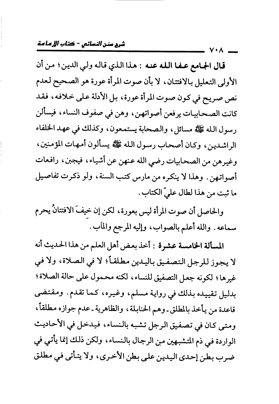 قال الجامع عفا الله عنه: هذا الذي قاله ولي الدين؛ من أن الأولى التعليل بالافتتان، لا بأن صوت المرأة عورة هو الصحيح لعدم نص صريح في كون صوت المرأة عورة، بل الأدلة على خلافه، فقد كانت الصحابيات يرفعن أصواتهن، وهن في صفوف النساء، فيسألن رسول الله -صلى الله عليه وسلم- مسائل، والصحابة يستمعون، وكذلك في عهد الخلفاء الراشدين، وكان أصحاب رسول الله -صلى الله عليه وسلم- يسألون أمهات المؤمنين، وغيرهن من الصحابيات رضي الله عنهن عن أشياء، فيجبن، رافعات أصواتهن. وهذا لا ينكره من مارس كتب السنة، ولو ذكرت تفاصيل ما ثبت من هذا لطال عليّ الكتاب.