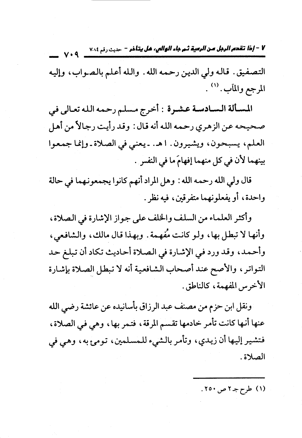 المسألة السادسة عشرة: أخرج مسلم رحمه الله تعالى في صحيحه عن الزهري رحمه الله أنه قال: وقد رأيت رجالاً من أهل العلم، يسبحون، ويشيرون. اهـ. -يعني في الصلاة- وإنما جمعوا بينهما لأن في كل منهما إفهامَ ما في النفس.