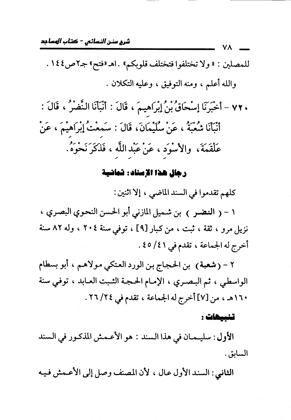 720 - أَخْبَرَنَا إِسْحَاقُ بْنُ إِبْرَاهِيمَ، قَالَ: أَنْبَأَنَا النَّضْرُ، قَالَ: أَنْبَأَنَا شُعْبَةُ، عَنْ سُلَيْمَانَ، قَالَ: سَمِعْتُ إِبْرَاهِيمَ، عَنْ عَلْقَمَةَ، وَالأَسْوَدِ، عَنْ عَبْدِ اللَّهِ، فَذَكَرَ نَحْوَهُ.