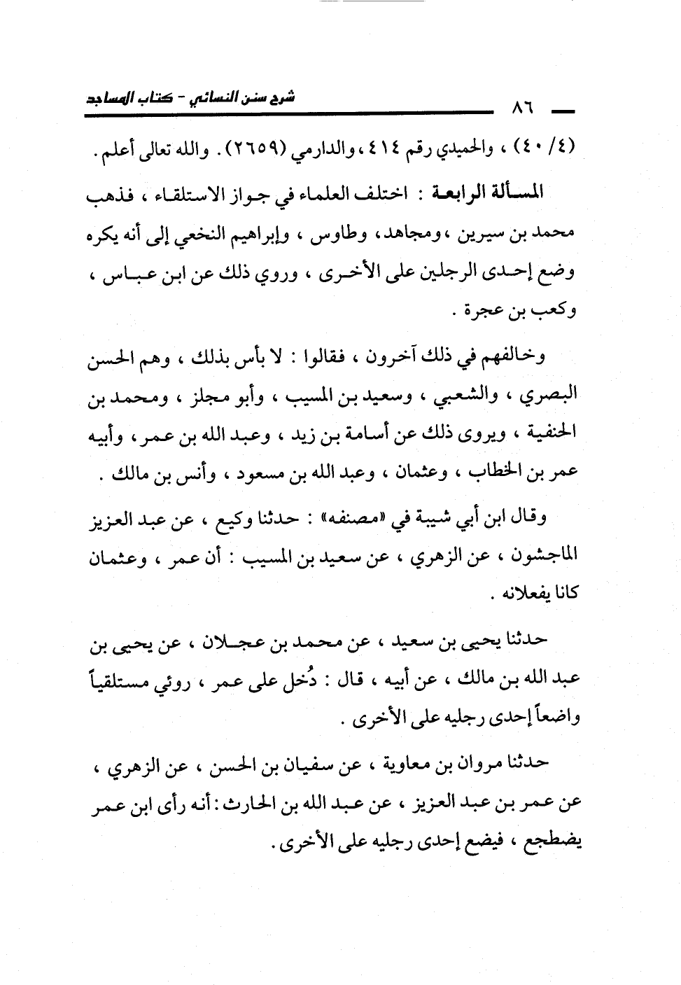 المسألة الرابعة: اختلف العلماء في جواز الاستلقاء، فذهب محمد بن سيرين، ومجاهد، وطاوس، وإبراهيم النخعي إلى أنه يكره وضع إحدى الرجلين على الأخرى، وروي ذلك عن ابن عباس، وكعب بن عجرة.