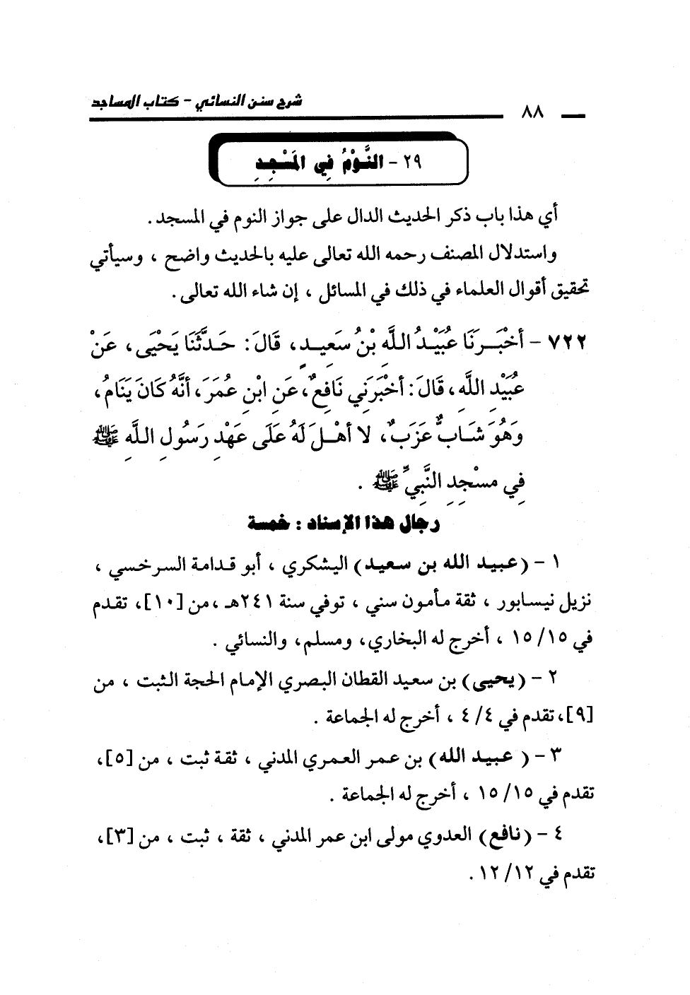 722 - أَخْبَرَنَا عُبَيْدُ اللَّهِ بْنُ سَعِيدٍ، قَالَ: حَدَّثَنَا يَحْيَى، عَنْ عُبَيْدِ اللَّهِ، قَالَ: أَخْبَرَنِي نَافِعٌ، عَنِ ابْنِ عُمَرَ، أَنَّهُ كَانَ يَنَامُ، وَهُوَ شَابٌّ عَزْبٌ، لاَ أَهْلَ لَهُ عَلَى عَهْدِ رَسُولِ اللَّهِ -صلى الله عليه وسلم- فِي مَسْجِدِ النَّبِىِّ -صلى الله عليه وسلم-.
