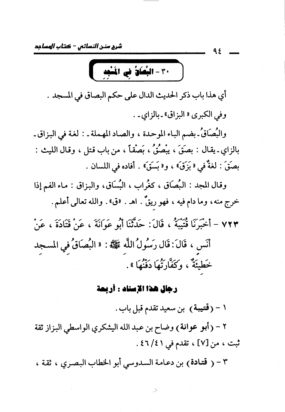 723 - أَخْبَرَنَا قُتَيْبَةُ، قَالَ: حَدَّثَنَا أَبُو عَوَانَةَ، عَنْ قَتَادَةَ، عَنْ أَنَسٍ، قَالَ: قَالَ رَسُولُ اللَّهِ -صلى الله عليه وسلم-: "الْبُصَاقُ فِي الْمَسْجِدِ خَطِيئَةٌ، وَكَفَّارَتُهَا دَفْنُهَا".