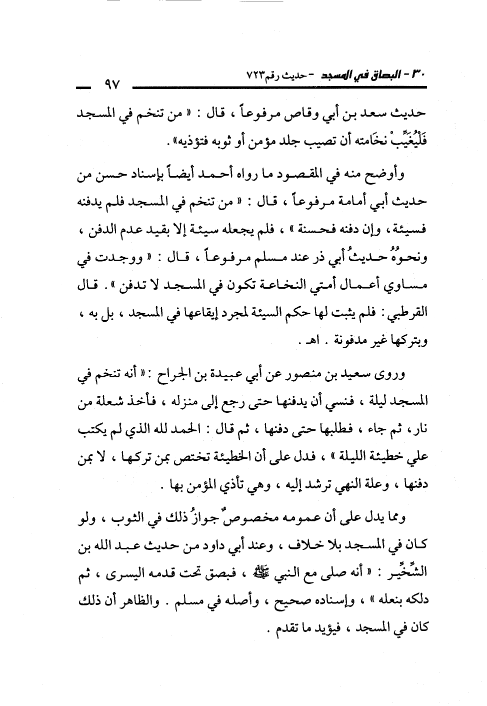 وأوضح منه في المقصود ما رواه أحمد أيضًا بإسناد حسن من حديث أبي أمامة مرفوعًا، قال: "من تنخم في المسجد فلم يدفنه فسيئة، وإن دفنه فحسنة"، فلم يجعله سيئة إلا بقيد عدم الدفن، ونحوُهُ حديثُ أبي ذر عند مسلم مرفوعًا، قال: "ووجدت في مساوي أعمال أمتي النخاعة تكون في المسجد لا تدفن". قال القرطبي: فلم يثبت لها حكم السيئة لمجرد إيقاعها في المسجد، بل به، وبتركها غير مدفونة. اهـ.