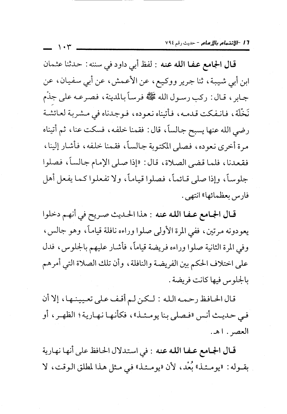 قال الجامع عفا الله عنه: لفظ أبي داود في سننه: حدثنا عثمان ابن أبي شيبة، ثنا جرير ووكيع، عن الأعمش، عن أبي سفيان، عن جابر، قال: ركب رسول الله -صلى الله عليه وسلم- فرساً بالمدينة، فصرعه على جِذْم نَخْلَة، فانفكت قدمه، فأتيناه نعوده، فوجدناه في مشربة لعائشة رضي الله عنها يسبح جالساً، قال: فقمنا خلفه، فسكت عنا، ثم أتيناه مرة أخرى نعوده، فصلى المكتوبة جالساً، فقمنا خلفه، فأشار إلينا، فقعدنا، فلما قضى الصلاة، قال: "إذا صلى الإمام جالساً، فصلوا جلوساً، وإذا صلى قائماً، فصلوا قياماً، ولا تفعلوا كما يفعل أهل فارس بعظمائها" انتهى.