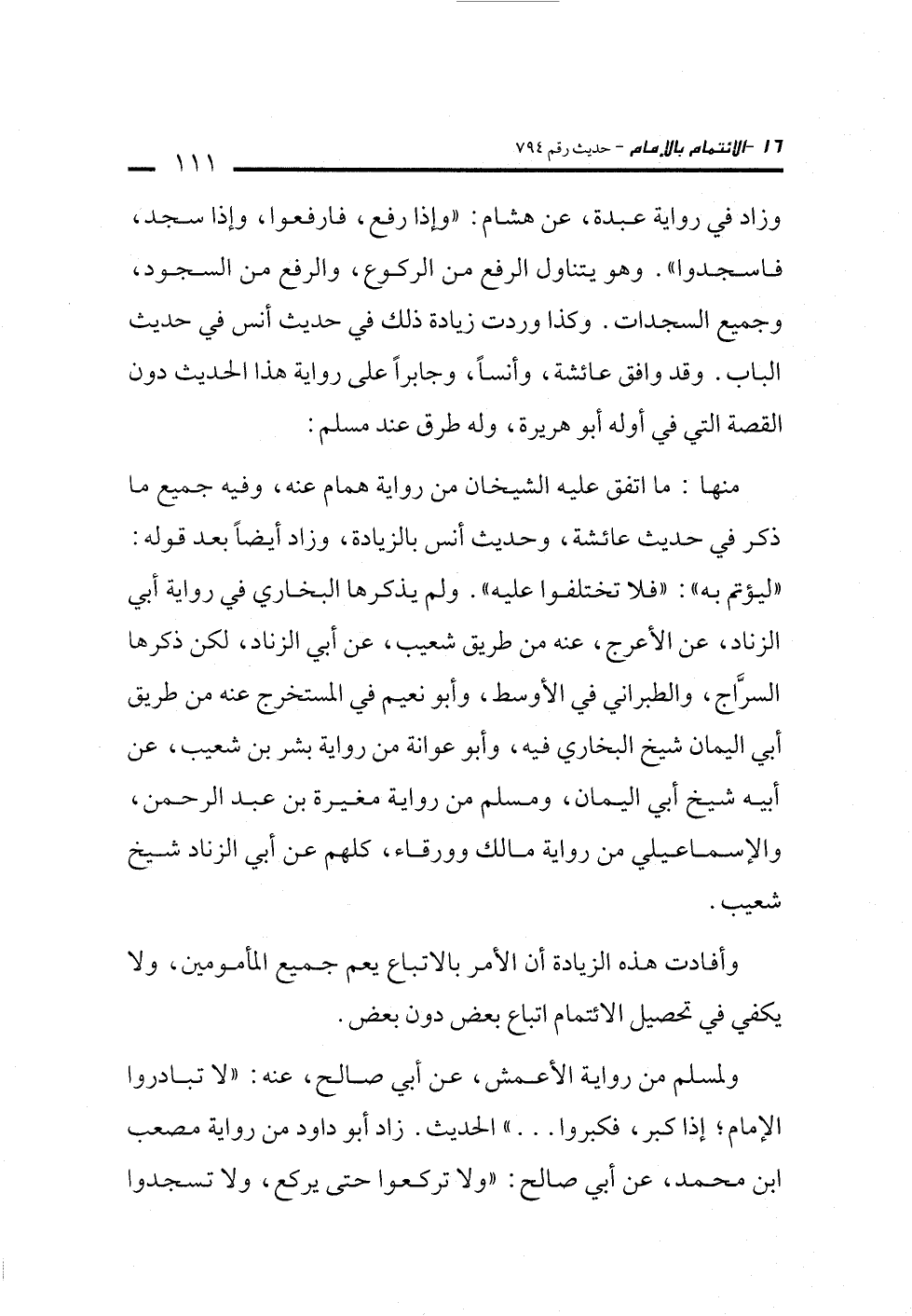 ولمسلم من رواية الأعمش، عن أبي صالح، عنه: "لا تبادروا الإمام؛ إذا كبر، فكبروا ... " الحديث. زاد أبو داود من رواية مصعب ابن محمد، عن أبي صالح: "ولا تركعوا حتى يركع، ولا تسجدوا