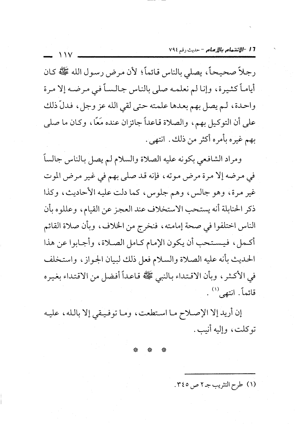 ومراد الشافعي بكونه عليه الصلاة والسلام لم يصل بالناس جالساً في مرضه إلا مرة مرض موته، فإنه قد صلى بهم في غير مرض الموت غير مرة، وهو جالس، وهم جلوس، كما دلت عليه الأحاديث، وكذا ذكر الحنابلة أنه يستحب الاستخلاف عند العجز عن القيام، وعللوه بأن الناس اختلفوا في صحة إمامته، فنخرج من الخلاف، وبأن صلاة القائم أكمل، فيستحب أن يكون الإمام كامل الصلاة، وأجابوا عن هذا الحديث بأنه عليه الصلاة والسلام فعل ذلك لبيان الجواز، واستخلف في الأكثر، وبأن الاقتداء بالنبي -صلى الله عليه وسلم- قاعداً أفضل من الاقتداء بغيره قائماً. انتهى (¬1).