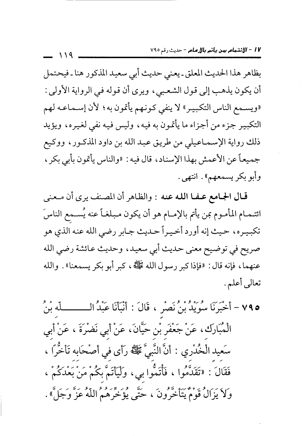 قال الجامع عفا الله عنه: والظاهر أن المصنف يرى أن معنى ائتمام المأموم بمن يأتم بالإمام هو أن يكون مبلغاً عنه يُسمِع الناسَ تكبيره، حيث إنه أورد أخيراً حديث جابر رضي الله عنه الذي هو صريح في توضيح معنى حديث أبي سعيد، وحديث عائشة رضي الله عنهما، فإنه قال: "فإذا كبر رسول الله -صلى الله عليه وسلم-، كبر أبو بكر يسمعنا". والله تعالى أعلم.