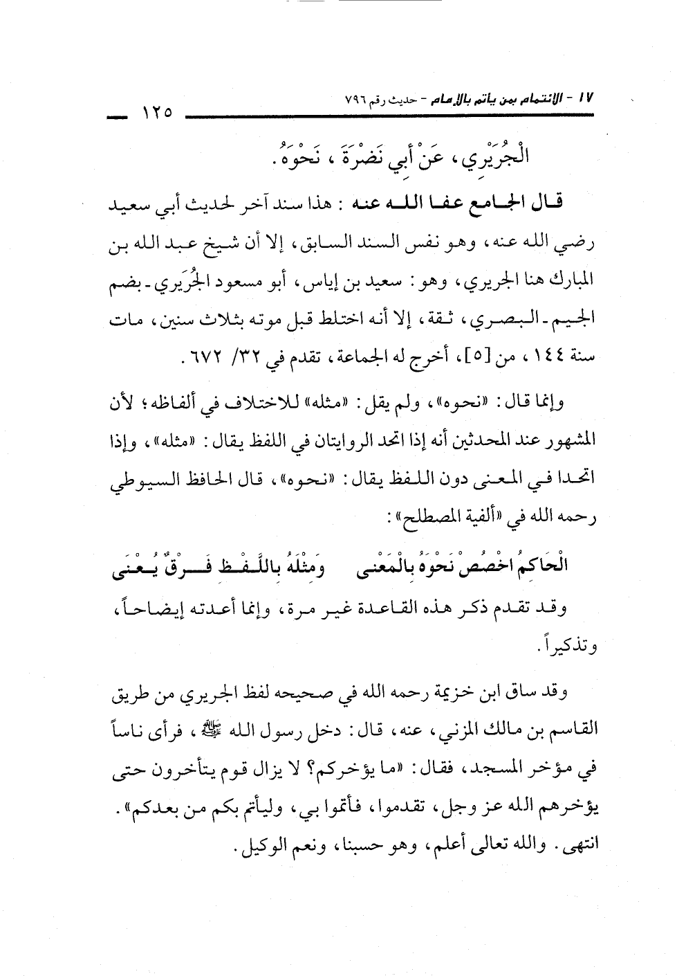 وقد ساق ابن خزيمة رحمه الله في صحيحه لفظ الجريري من طريق القاسم بن مالك المزني، عنه، قال: دخل رسول الله -صلى الله عليه وسلم-، فرأى ناساً في مؤخر المسجد، فقال: "ما يؤخركم؟ لا يزال قوم يتأخرون حتى يؤخرهم الله عز وجل، تقدموا، فأتموا بي، وليأتم بكم من بعدكم". انتهى. والله تعالى أعلم، وهو حسبنا، ونعم الوكيل.