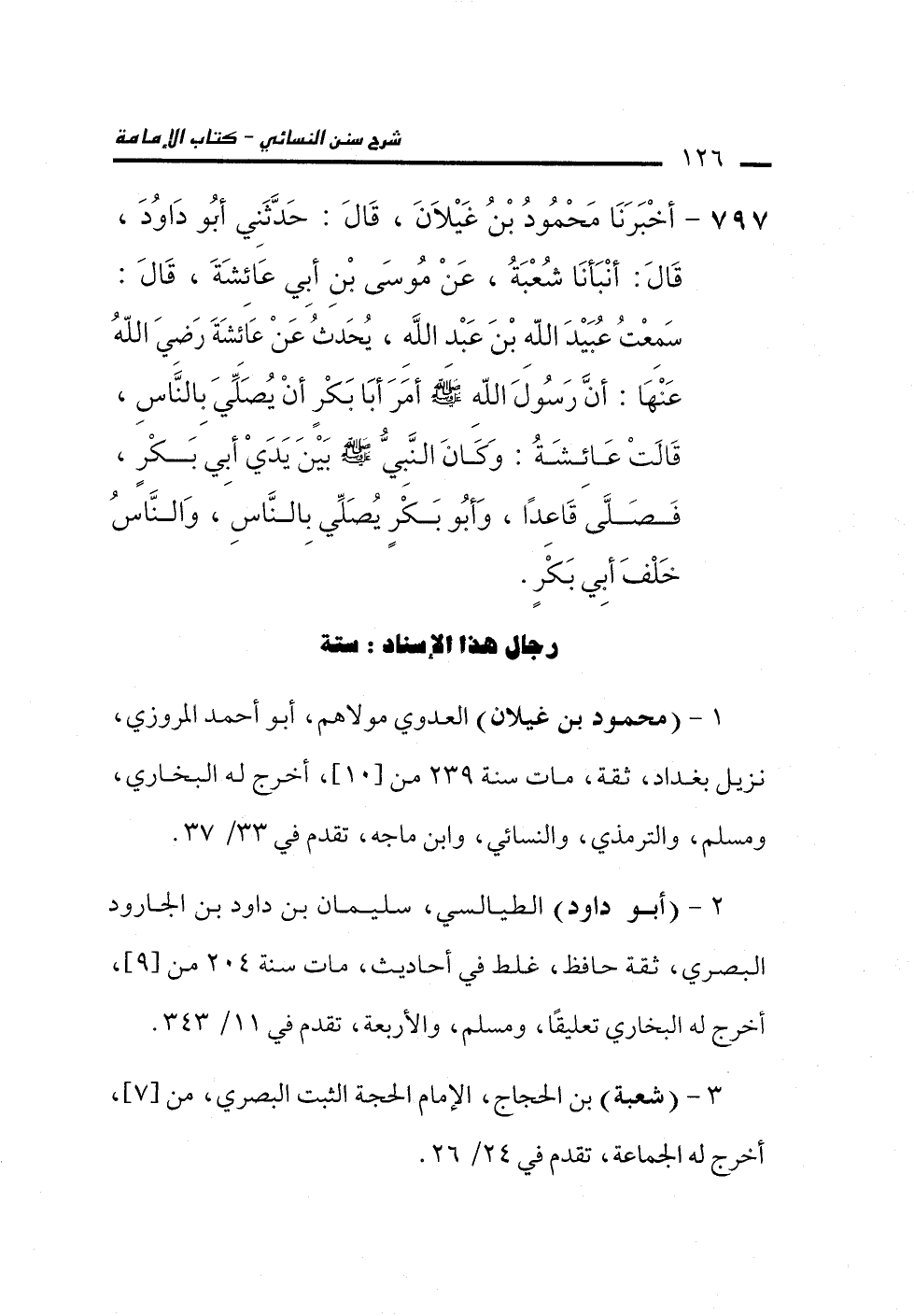 797 - أَخْبَرَنَا مَحْمُودُ بْنُ غَيْلاَنَ، قَالَ: حَدَّثَنِي أَبُو دَاوُدَ، قَالَ: أَنْبَأَنَا شُعْبَةُ، عَنْ مُوسَى بْنِ أَبِي عَائِشَةَ، قَالَ: سَمِعْتُ عُبَيْدَ اللَّهِ بْنَ عَبْدِ اللَّهِ، يُحَدِّثُ عَنْ عَائِشَةَ رضى الله عنها: أَنَّ رَسُولَ اللَّهِ -صلى الله عليه وسلم- أَمَرَ أَبَا بَكْرٍ أَنْ يُصَلِّيَ بِالنَّاسِ، قَالَتْ عَائِشَةَ: وَكَانَ النَّبِيُّ -صلى الله عليه وسلم- بَيْنَ يَدَيْ أَبِي بَكْرٍ، فَصَلَّى قَاعِدًا، وَأَبُو بَكْرٍ يُصَلِّي بِالنَّاسِ، وَالنَّاسُ خَلْفَ أَبِي بَكْرٍ.
