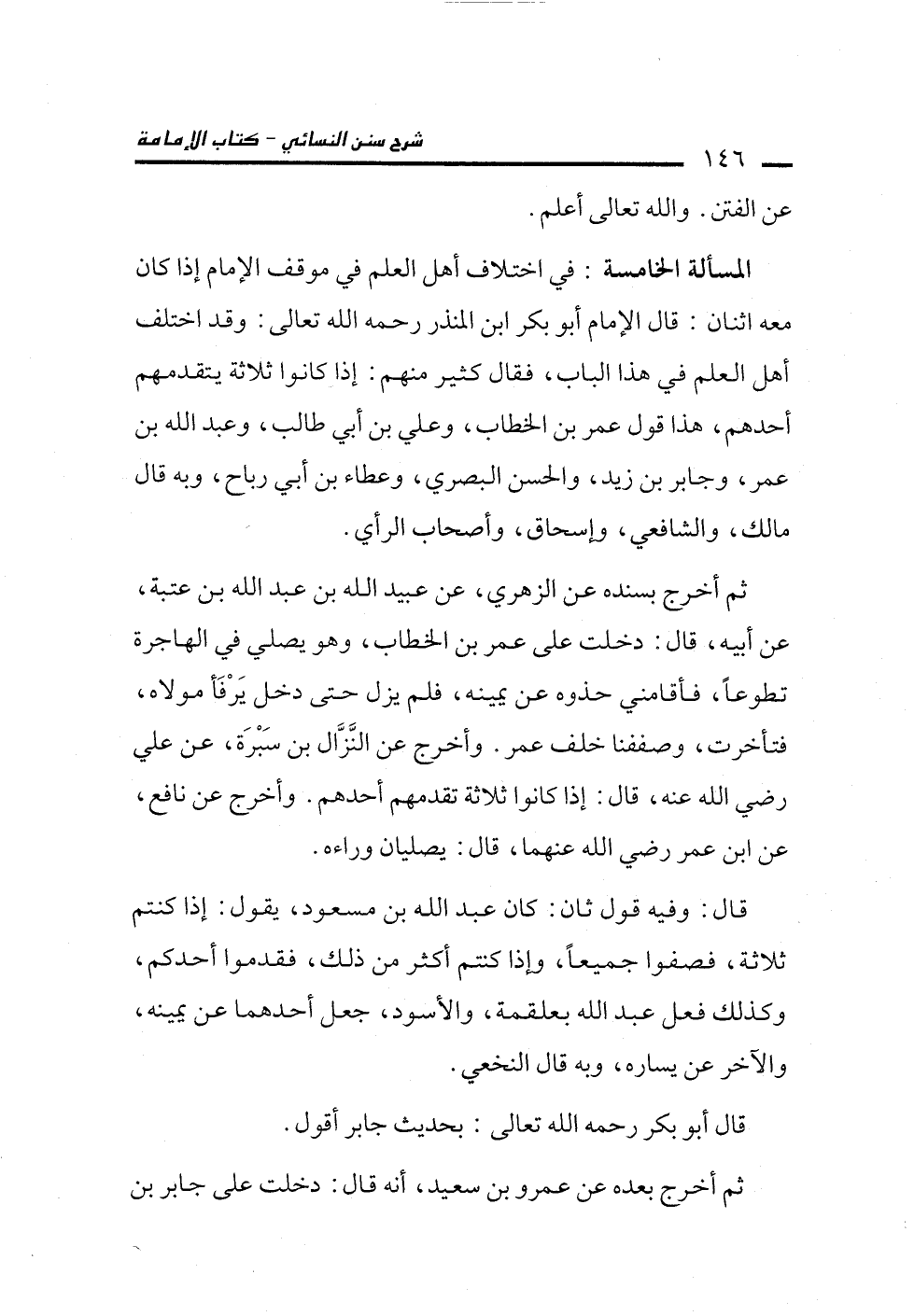 المسألة الخامسة: في اختلاف أهل العلم في موقف الإمام إذا كان معه اثنان: قال الإمام أبو بكر ابن المنذر رحمه الله تعالى: وقد اختلف أهل العلم في هذا الباب، فقال كثير منهم: إذا كانوا ثلاثة يتقدمهم أحدهم، هذا قول عمر بن الخطاب، وعلي بن أبي طالب، وعبد الله بن عمر، وجابر بن زيد، والحسن البصري، وعطاء بن أبي رباح، وبه قال مالك، والشافعي، وإسحاق، وأصحاب الرأي.