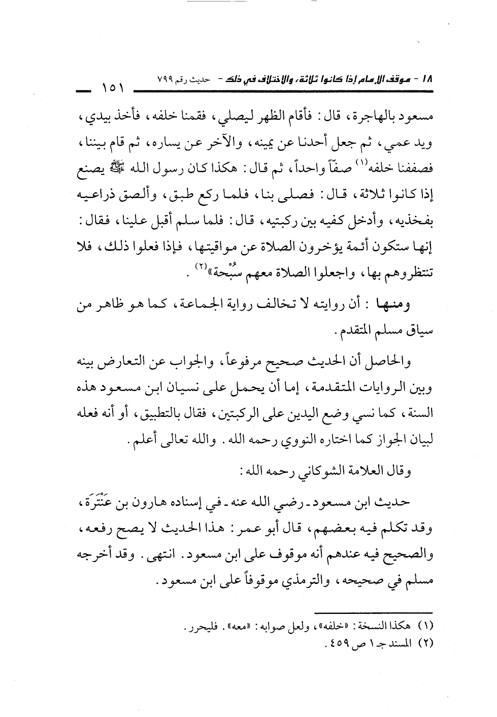 والحاصل أن الحديث صحيح مرفوعاً، والجواب عن التعارض بينه وبين الروايات المتقدمة، إما أن يحمل على نسيان ابن مسعود هذه السنة، كما نسي وضع اليدين على الركبتين، فقال بالتطبيق، أو أنه فعله لبيان الجواز كما اختاره النووي رحمه الله. والله تعالى أعلم.
