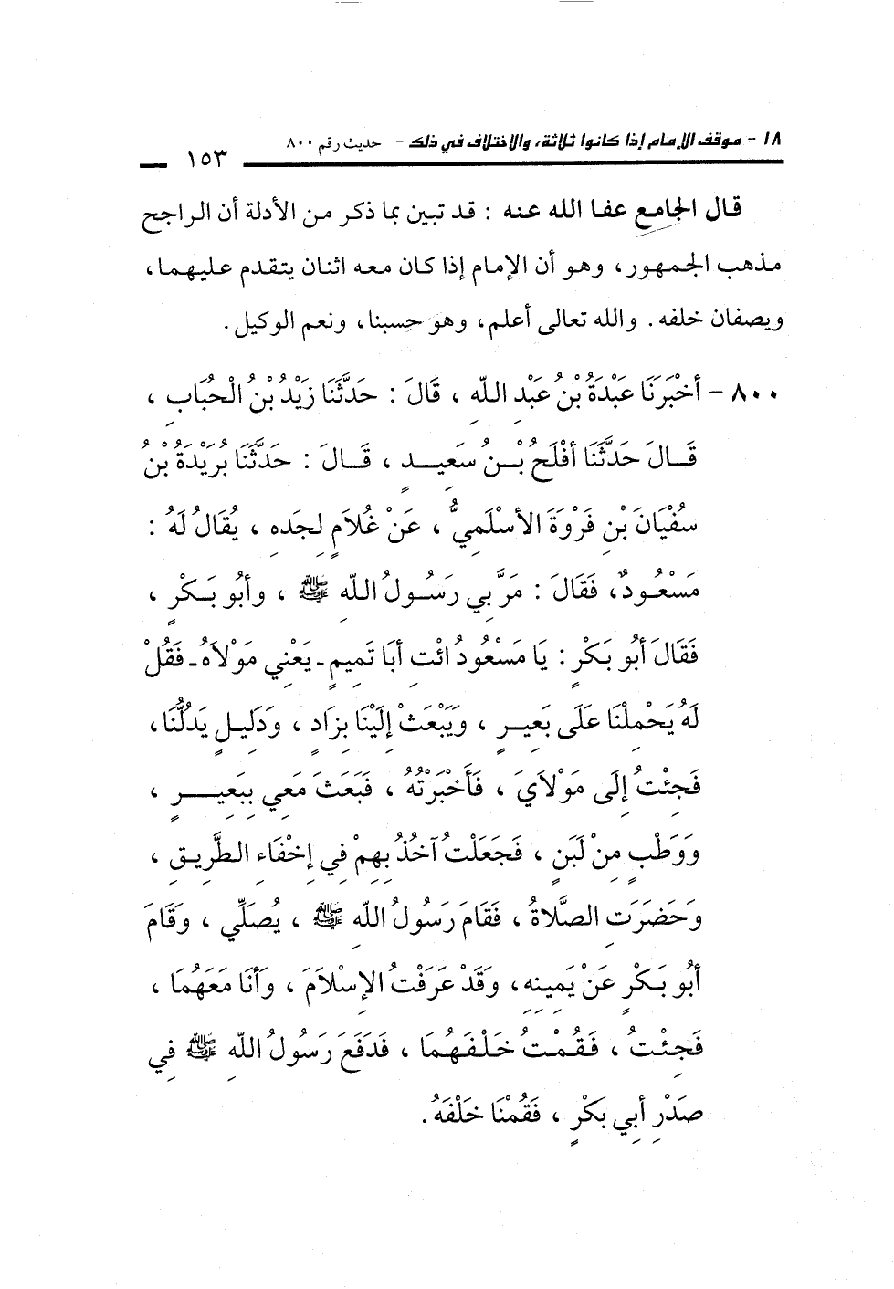 800 - أَخْبَرَنَا عَبْدَةُ بْنُ عَبْدِ اللَّهِ، قَالَ: حَدَّثَنَا زَيْدُ بْنُ الْحُبَابِ، قَالَ حَدَّثَنَا أَفْلَحُ بْنُ سَعِيدٍ، قَالَ: حَدَّثَنَا بُرَيْدَةُ بْنُ سُفْيَانَ بْنِ فَرْوَةَ الأَسْلَمِيُّ، عَنْ غُلاَمٍ لِجَدِّهِ، يُقَالُ لَهُ: مَسْعُودٌ، فَقَالَ: مَرَّ بِي رَسُولُ اللَّهِ -صلى الله عليه وسلم-، وَأَبُو بَكْرٍ، فَقَالَ أَبُو بَكْرٍ: يَا مَسْعُودُ ائْتِ أَبَا تَمِيمٍ -يَعْنِي مَوْلاَهُ- فَقُلْ لَهُ يَحْمِلْنَا عَلَى بَعِيرٍ، وَيَبْعَثْ إِلَيْنَا بِزَادٍ، وَدَلِيلٍ يَدُلُّنَا، فَجِئْتُ إِلَى مَوْلاَيَ، فَأَخْبَرْتُهُ، فَبَعَثَ مَعِي بِبَعِيرٍ، وَوَطْبٍ مِنْ لَبَنٍ، فَجَعَلْتُ آخُذُ بِهِمْ فِي إِخْفَاءِ الطَّرِيقِ، وَحَضَرَتِ الصَّلاَةُ، فَقَامَ رَسُولُ اللَّهِ -صلى الله عليه وسلم- يُصَلِّي، وَقَامَ أَبُو بَكْرٍ عَنْ يَمِينِهِ، وَقَدْ عَرَفْتُ الإِسْلاَمَ، وَأَنَا مَعَهُمَا، فَجِئْتُ، فَقُمْتُ خَلْفَهُمَا، فَدَفَعَ رَسُولُ اللَّهِ -صلى الله عليه وسلم- فِي صَدْرِ أَبِي بَكْرٍ، فَقُمْنَا خَلْفَهُ.