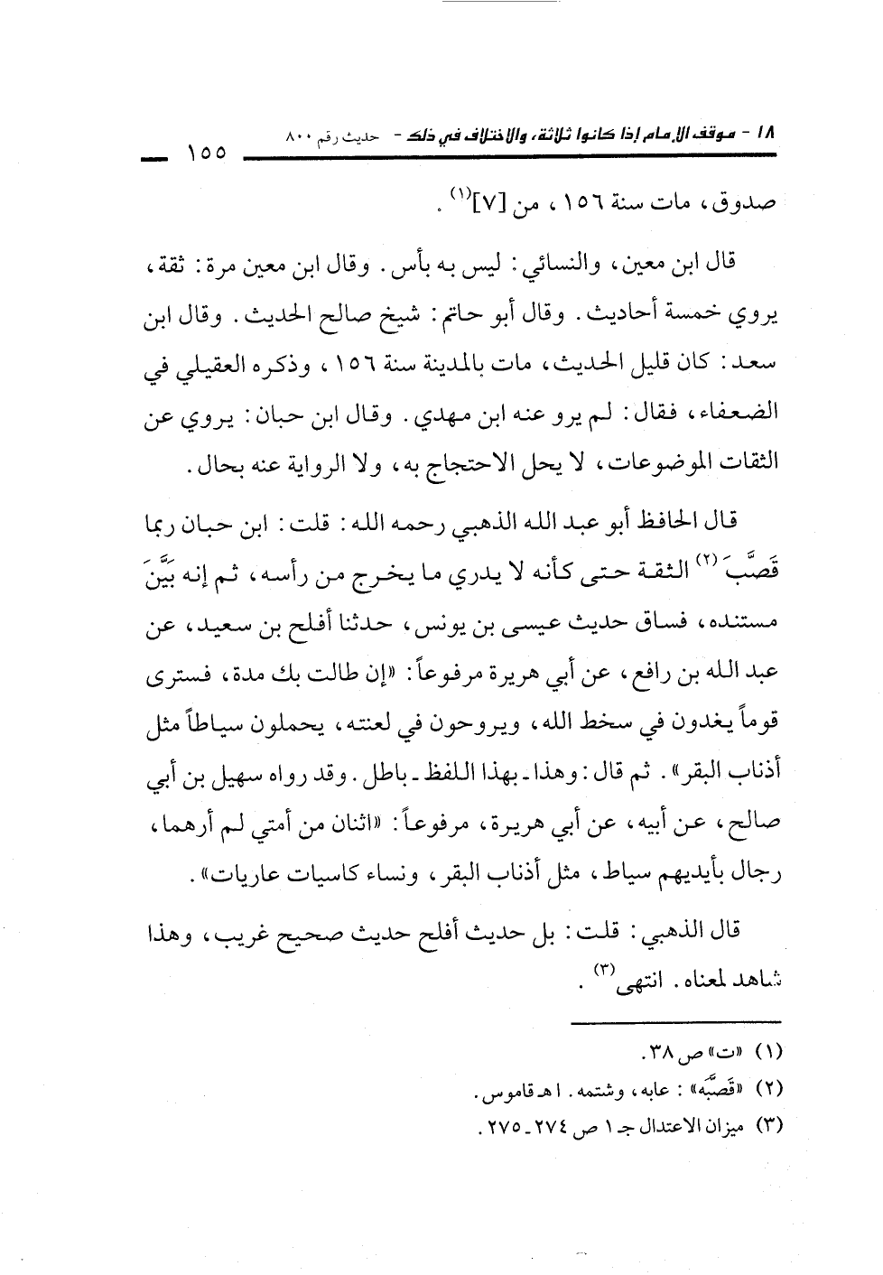 قال الحافظ أبو عبد الله الذهبي رحمه الله: قلت: ابن حبان ربما قَصَّبَ (¬2) الثقة حتى كأنه لا يدري ما يخرج من رأسه، ثم إنه بَيَّنَ مستنده، فساق حديث عيسى بن يونس، حدثنا أفلح بن سعيد، عن عبد الله بن رافع، عن أبي هريرة مرفوعاً: "إن طالت بك مدة، فسترى قوماً يغدون في سخط الله، ويروحون في لعنته، يحملون سياطاً مثل أذناب البقر". ثم قال: وهذا -بهذا اللفظ- باطل. وقد رواه سهيل بن أبي صالح، عن أبيه، عن أبي هريرة، مرفوعاً: "اثنان من أمتي لم أرهما، رجال بأيديهم سياط، مثل أذناب البقر، ونساء كاسيات عاريات".