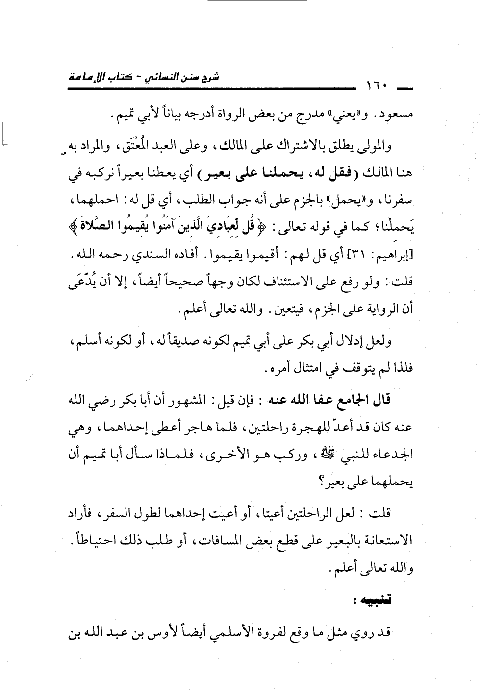 قال الجامع عفا الله عنه: فإن قيل: المشهور أن أبا بكر رضي الله عنه كان قد أعدّ للهجرة راحلتين، فلما هاجر أعطى إحداهما، وهي الجدعاء للنبي -صلى الله عليه وسلم-، وركب هو الأخرى، فلماذا سأل أبا تميم أن يحملهما على بعير؟