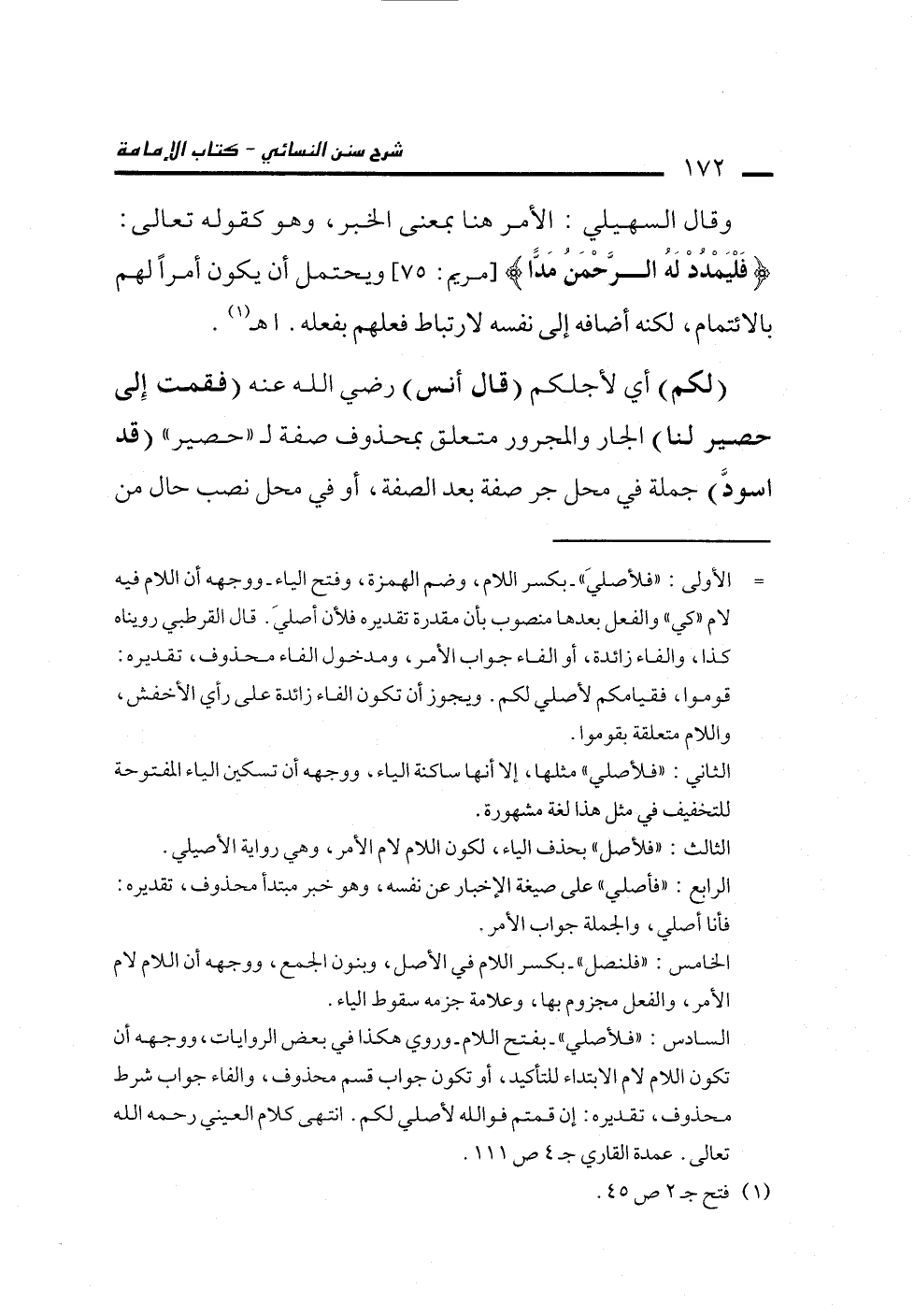 الخامس: "فلنصل" -بكسر اللام في الأصل، وبنون الجمع، ووجهه أن اللام لام الأمر، والفعل مجزوم بها، وعلامة جزمه سقوط الياء.