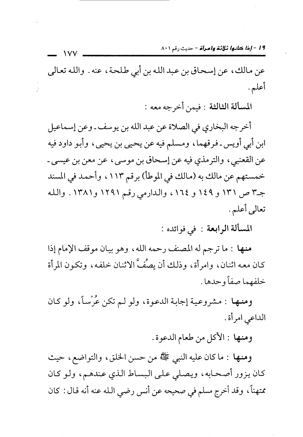 منها: ما ترجم له المصنف رحمه الله، وهو بيان موقف الإمام إذا كان معه اثنان، وامرأة، وذلك أن يصُفَّ الاثنان خلفه، وتكون المرأة خلفهما صفاً وحدها.