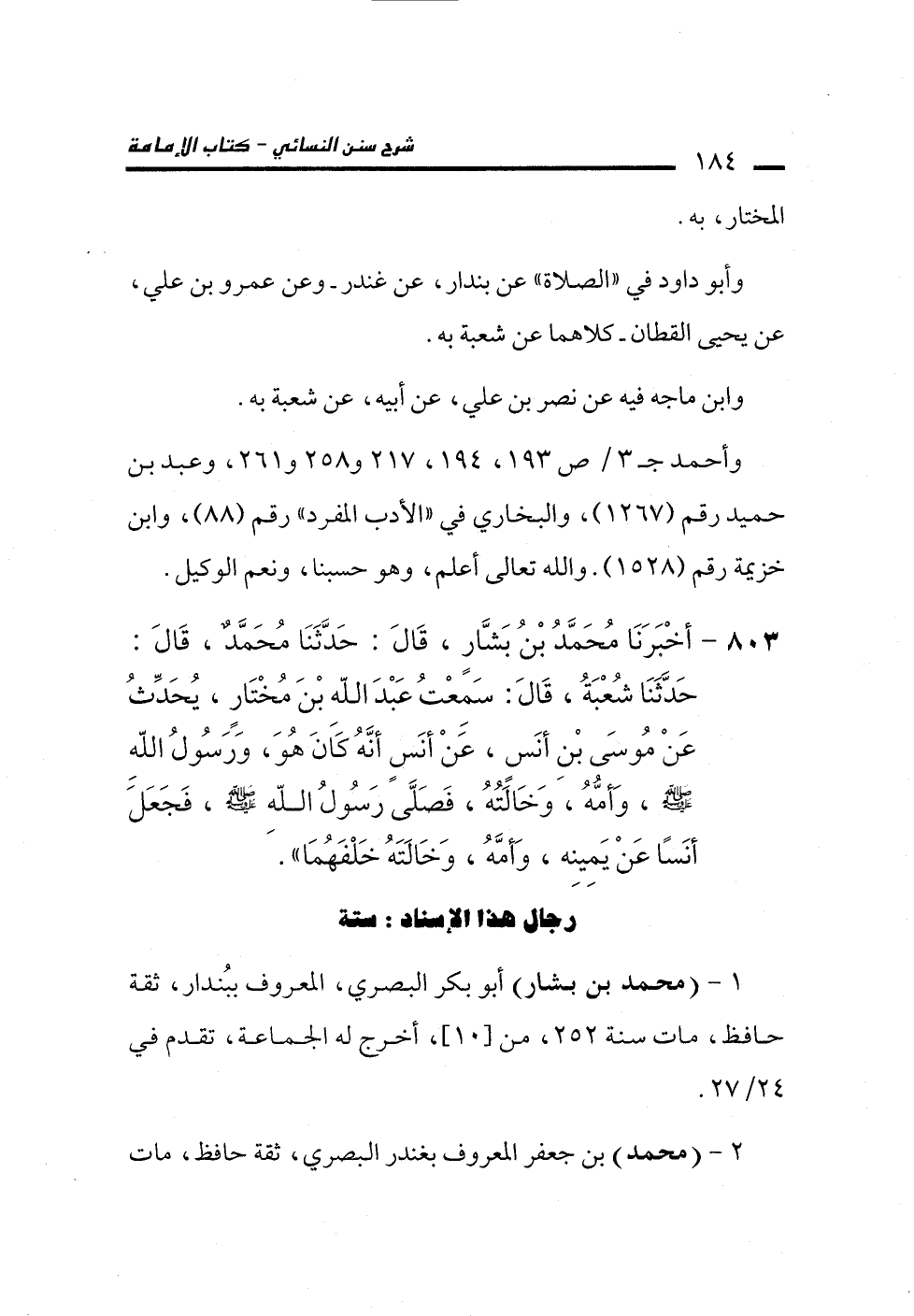 803 - أَخْبَرَنَا مُحَمَّدُ بْنُ بَشَّارٍ، قَالَ: حَدَّثَنَا مُحَمَّدٌ، قَالَ: حَدَّثَنَا شُعْبَةُ، قَالَ: سَمِعْتُ عَبْدَ اللَّهِ بْنَ مُخْتَارٍ، يُحَدِّثُ عَنْ مُوسَى بْنِ أَنَسٍ، عَنْ أَنَسٍ أَنَّهُ كَانَ هُوَ، وَرَسُولُ اللَّهِ -صلى الله عليه وسلم-، وَأُمُّهُ، وَخَالَتُهُ، فَصَلَّى رَسُولُ اللَّهِ -صلى الله عليه وسلم-، فَجَعَلَ أَنَسًا عَنْ يَمِينِهِ، وَأُمَّهُ، وَخَالَتَهُ خَلْفَهُمَا.