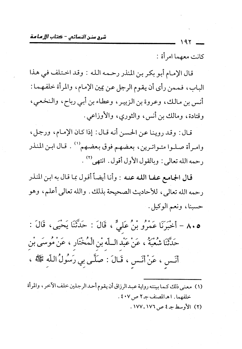 (¬1) معنى ذلك كما بينته رواية عبد الرزاق أن يقوم أحد الرجلين خلف الآخر، والمرأة خلفهما. اهـ المصنف جـ 2 ص 407.
