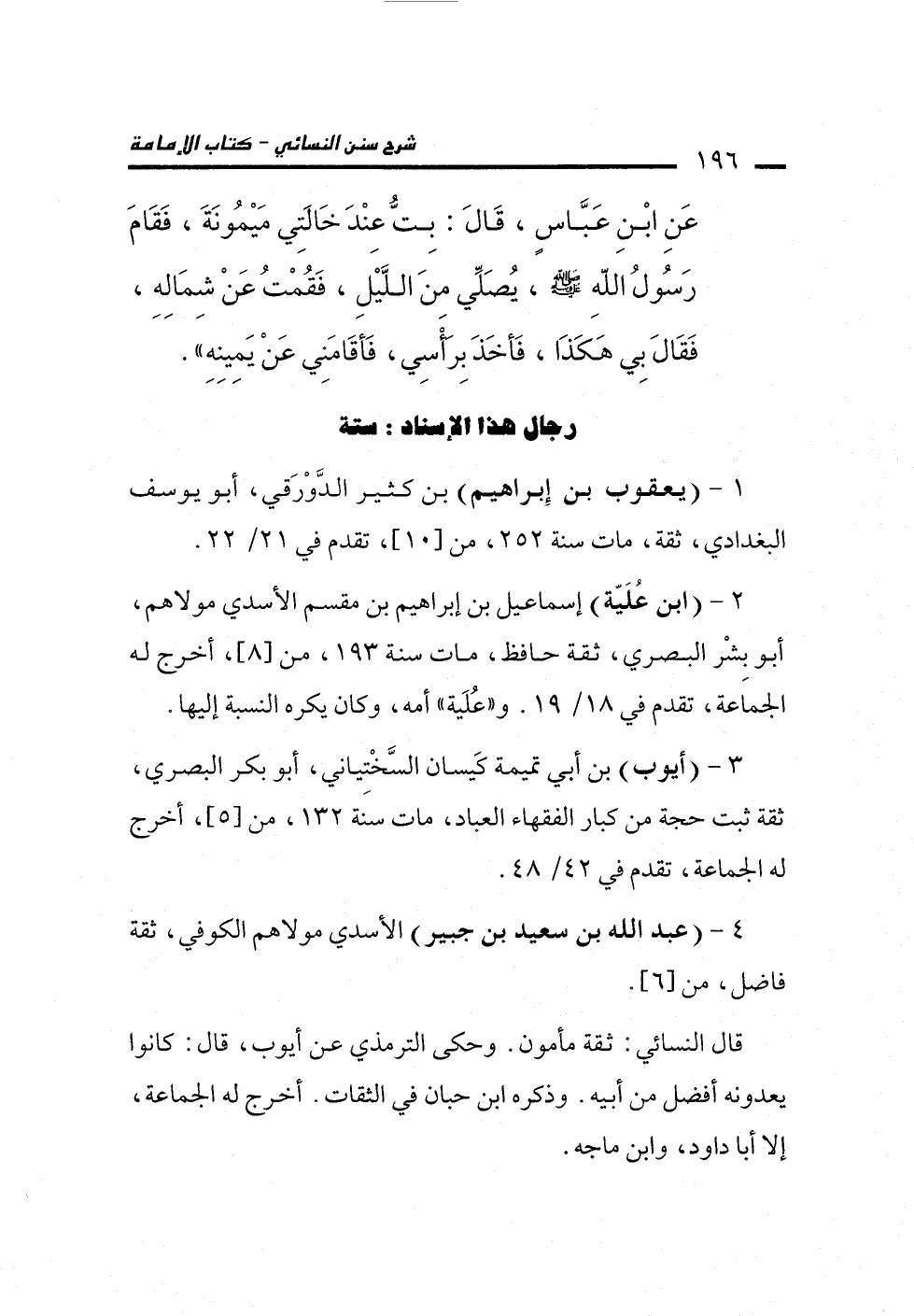 عَنِ ابْنِ عَبَّاسٍ، قَالَ: بِتُّ عِنْدَ خَالَتِي مَيْمُونَةَ، فَقَامَ رَسُولُ اللَّهِ -صلى الله عليه وسلم-، يُصَلِّي مِنَ اللَّيْلِ، فَقُمْتُ عَنْ شِمَالِهِ، فَقَالَ بِي هَكَذَا، فَأَخَذَ بِرَأْسِي، فَأَقَامَنِي عَنْ يَمِينِهِ".