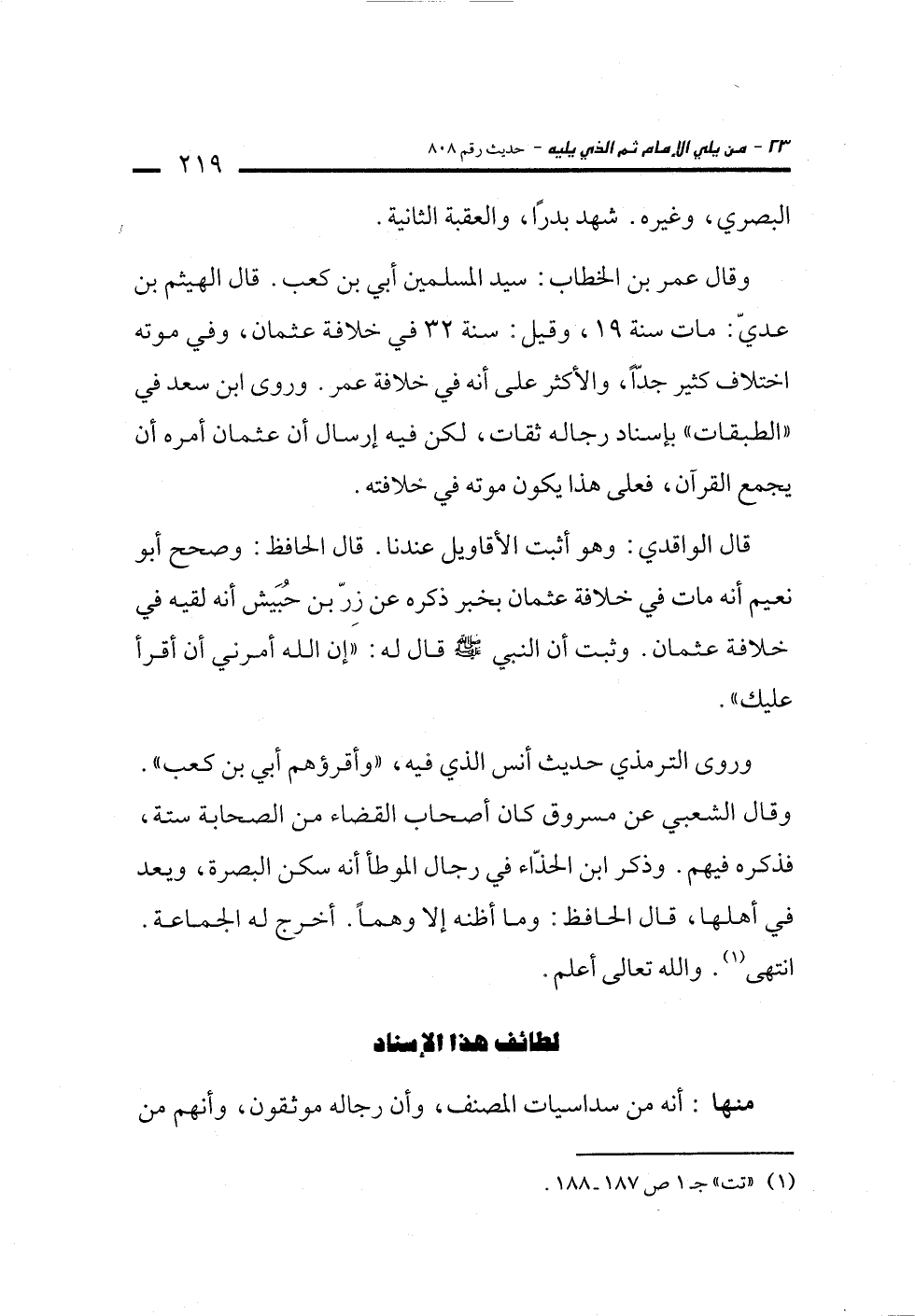 وقال عمر بن الخطاب: سيد المسلمين أبي بن كعب. قال الهيثم بن عديّ: مات سنة 19، وقيل: سنة 32 في خلافة عثمان، وفي موته اختلاف كثير جدّاً، والأكثر على أنه في خلافة عمر. وروى ابن سعد في "الطبقات" بإسناد رجاله ثقات، لكن فيه إرسال أن عثمان أمره أن يجمع القرآن، فعلى هذا يكون موته في خلافته.