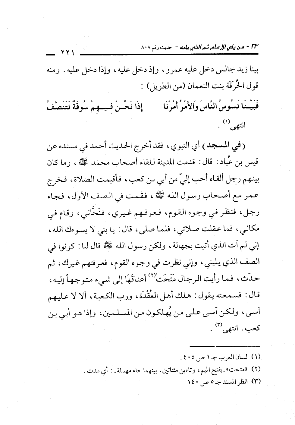 (في المسجد) أي النبوي، فقد أخرج الحديث أحمد في مسنده عن قيس بن عُباد: قال: قدمت المدينة للقاء أصحاب محمد -صلى الله عليه وسلم-، وما كان بينهم رجل ألقاه أحب إليّ من أبي بن كعب، فأقيمت الصلاة، فخرج عمر مع أصحاب رسول الله -صلى الله عليه وسلم-، فقمت في الصف الأول، فجاء رجل، فنظر في وجوه القوم، فعرفهم غيري، فنَحَّاني، وقام في مكاني، فما عقلت صلاتي، فلما صلى، قال: يا بني لا يسوءك الله، إني لم آت الذي أتيت بجهالة، ولكن رسول الله -صلى الله عليه وسلم- قال لنا: كونوا في الصف الذي يليني، وإني نظرت في وجوه القوم، فعرفتهم غيرك، ثم حدّث، فما رأيت الرجال مَتَحَتْ (¬2) أعناقَهَا إلى شيء متوجهاً إليه، قال: فسمعته يقول: هلك أهل العُقْدَة، ورب الكعبة، ألا لا عليهم آسى، ولكن آسى على من يُهلكون عن المسلمين، وإذا هو أبي بن كعب. انتهى (¬3).