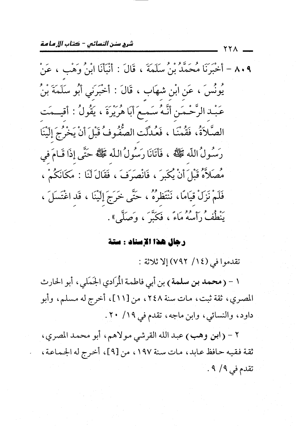809 - أَخْبَرَنَا مُحَمَّدُ بْنُ سَلَمَةَ، قَالَ: أَنْبَأَنَا ابْنُ وَهْبٍ، عَنْ يُونُسَ، عَنِ ابْنِ شِهَابٍ، قَالَ: أَخْبَرَنِي أَبُو سَلَمَةَ بْنُ عَبْدِ الرَّحْمَنِ أَنَّهُ سَمِعَ أَبَا هُرَيْرَةَ، يَقُولُ: أُقِيمَتِ الصَّلاَةُ، فَقُمْنَا، فَعُدِّلَتِ الصُّفُوفُ قَبْلَ أَنْ يَخْرُجَ إِلَيْنَا رَسُولُ اللَّهِ -صلى الله عليه وسلم-، فَأَتَانَا رَسُولُ اللَّهِ -صلى الله عليه وسلم- حَتَّى إِذَا قَامَ فِي مُصَلاَّهُ قَبْلَ أَنْ يُكَبِّرَ، فَانْصَرَفَ، فَقَالَ لَنَا: مَكَانَكُمْ، فَلَمْ نَزَلْ قِيَامًا، نَنْتَظِرُهُ حَتَّى خَرَجَ إِلَيْنَا، قَدِ اغْتَسَلَ، يَنْطِفُ رَأْسُهُ مَاءً، فَكَبَّرَ، وَصَلَّى.