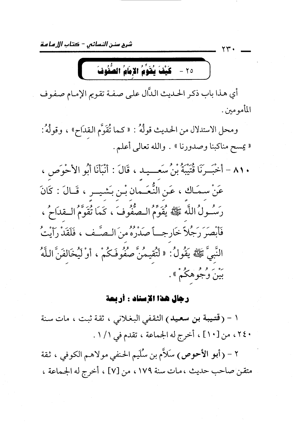 810 - أَخْبَرَنَا قُتَيْبَةُ بْنُ سَعِيدٍ، قَالَ: أَنْبَأَنَا أَبُو الأَحْوَصِ، عَنْ سِمَاكٍ، عَنِ النُّعْمَانِ بْنِ بَشِيرٍ، قَالَ: كَانَ رَسُولُ اللَّهِ -صلى الله عليه وسلم- يُقَوِّمُ الصُّفُوفَ، كَمَا تُقَوَّمُ الْقِدَاحُ، فَأَبْصَرَ رَجُلاً خَارِجًا صَدْرُهُ مِنَ الصَّفِّ، فَلَقَدْ رَأَيْتُ النَّبِيَّ -صلى الله عليه وسلم- يَقُولُ: "لَتُقِيمُنَّ صُفُوفَكُمْ، أَوْ لَيُخَالِفَنَّ اللَّهُ بَيْنَ وُجُوهِكُمْ".