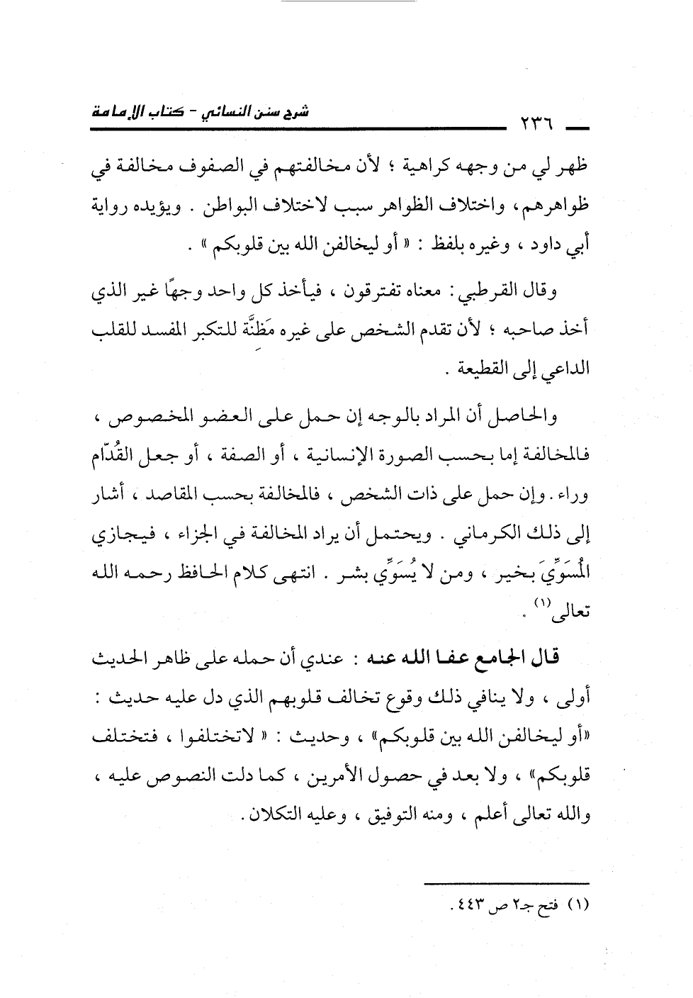 قال الجامع عفا الله عنه: عندي أن حمله على ظاهر الحديث أولى، ولا ينافي ذلك وقوع تخالف قلوبهم الذي دل عليه حديث: "أو ليخالفن الله بن قلوبكم"، وحديث: "لا تختلفوا، فتختلف قلوبكم"، ولا بعد في حصول الأمرين, كما دلت النصوص عليه، والله تعالى أعلم، ومنه التوفيق، وعليه التكلان.