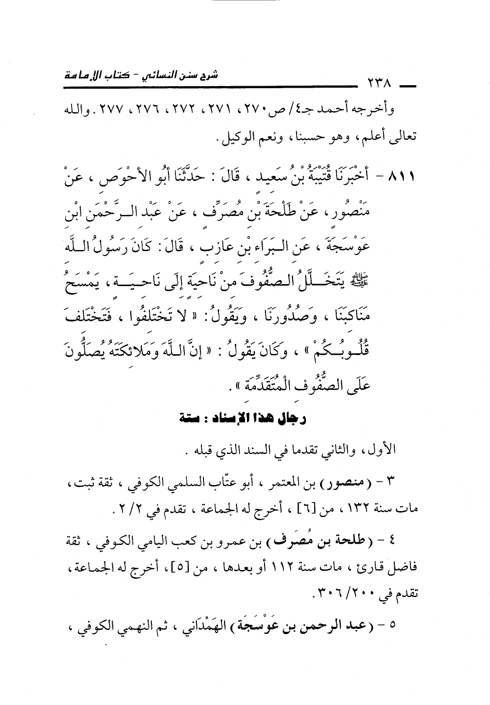 811 - أَخْبَرَنَا قُتَيْبَةُ بْنُ سَعِيدٍ، قَالَ: حَدَّثَنَا أَبُو الأَحْوَصِ، عَنْ مَنْصُورٍ، عَنْ طَلْحَةَ بْنِ مُصَرِّفٍ، عَنْ عَبْدِ الرَّحْمَنِ بْنِ عَوْسَجَةَ، عَنِ الْبَرَاءِ بْنِ عَازِبٍ، قَالَ: كَانَ رَسُولُ اللَّهِ -صلى الله عليه وسلم- يَتَخَلَّلُ الصُّفُوفَ مِنْ نَاحِيَةٍ إِلَى نَاحِيَةٍ، يَمْسَحُ مَنَاكِبَنَا، وَصُدُورَنَا، وَيَقُولُ: "لاَ تَخْتَلِفُوا، فَتَخْتَلِفَ قُلُوبُكُمْ"، وَكَانَ يَقُولُ: "إِنَّ اللَّهَ وَمَلاَئِكَتَهُ يُصَلُّونَ عَلَى الصُّفُوفِ الْمُتَقَدِّمَةِ".