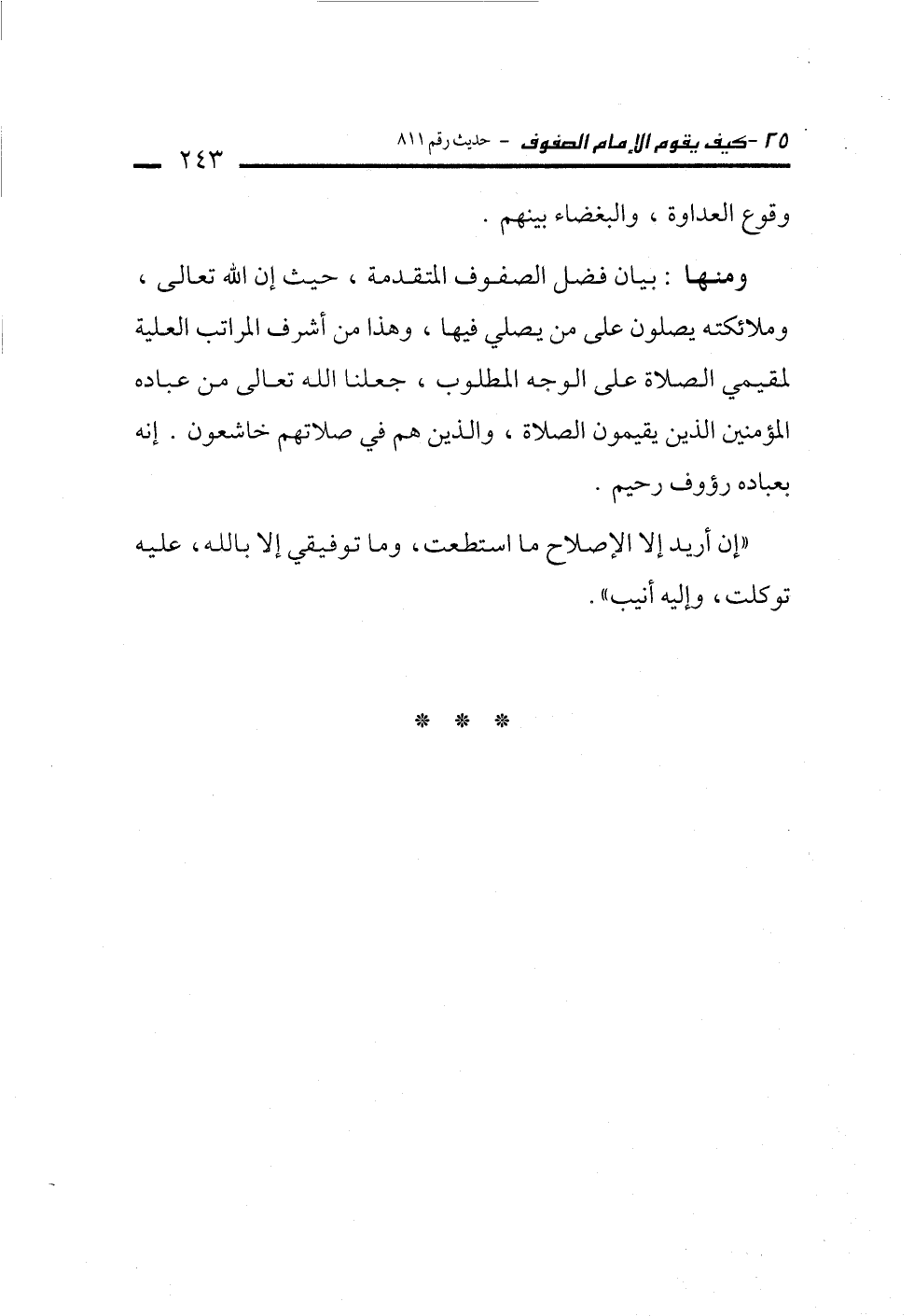 ومنها: بيان فضل الصفوف المتقدمة، حيث إن الله تعالى، وملائكته يصلون على من يصلي فيها، وهذا من أشرف المراتب العلية لمقيمي الصلاة على الوجه المطلوب جعلنا الله تعالى من عباده المؤمنين الذي يقيمون الصلاة، والذي هم في صلاتهم خاشعون، إنه لعباده رؤوف رحيم.