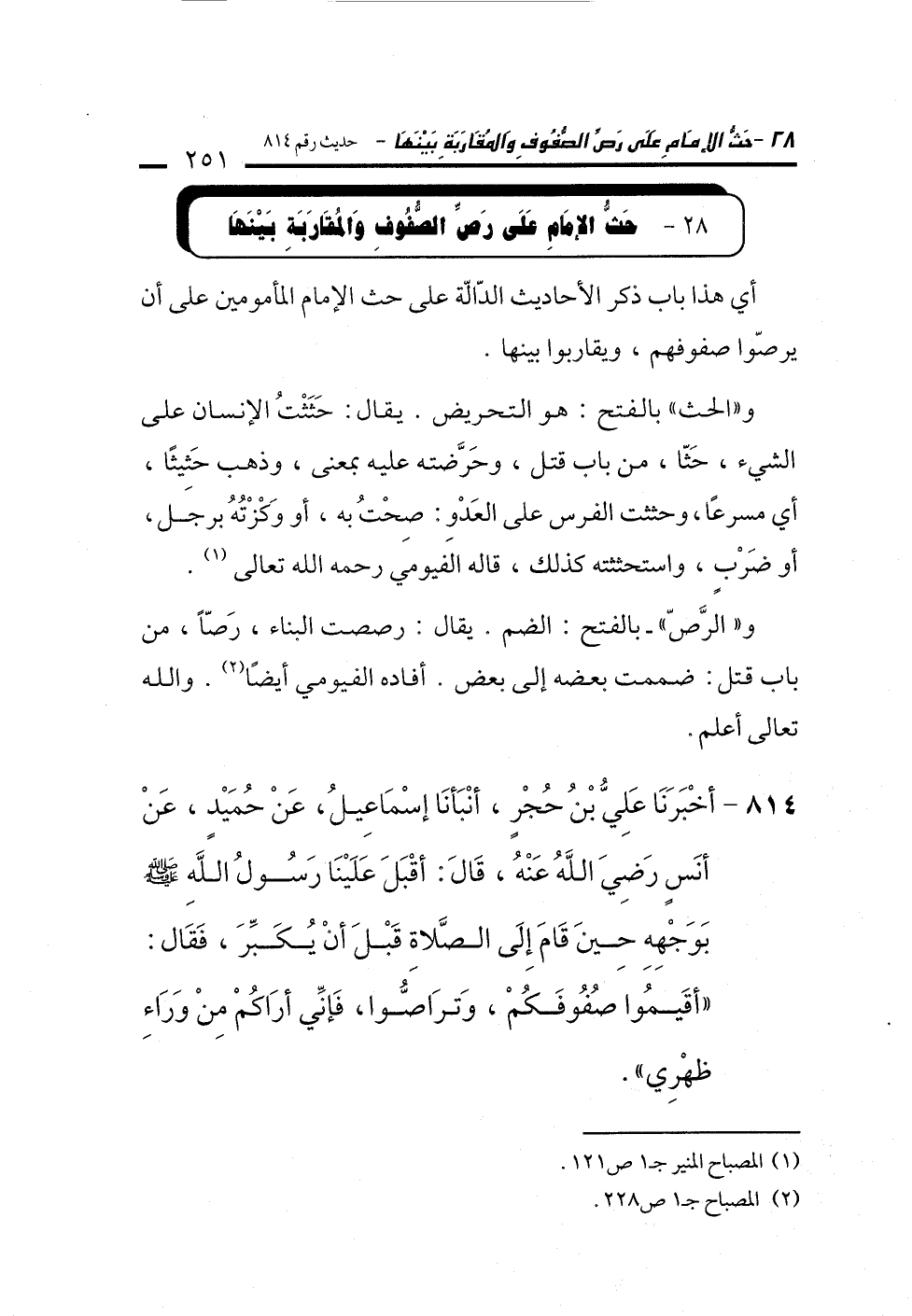 28 - حَثُّ الإِمَامِ عَلَى رَصِّ الصُّفُوفِ وَالْمُقَارَبَةِ بَيْنَهَا