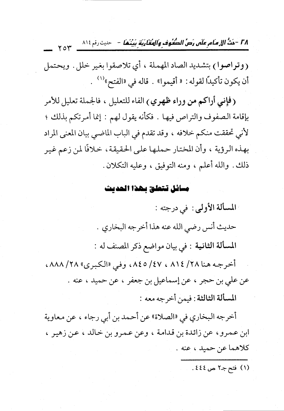 (فإني أراكم من وراء ظهري) الفاء للتعليل، فالجملة تعليل للأمر بإقامة الصفوف والتر اص فيها. فكأنه يقول لهم: إنما أمرتكم بذلك؛ لأني تحققت منكم خلافه، وقد تقدم في الباب الماضي بيان المعنى المراد بهذه الرؤية، وأن المختار حملها على الحقيقة، خلافًا لمن زعم غير ذلك. والله أعلم، ومنه التوفيق، وعليه التكلان.