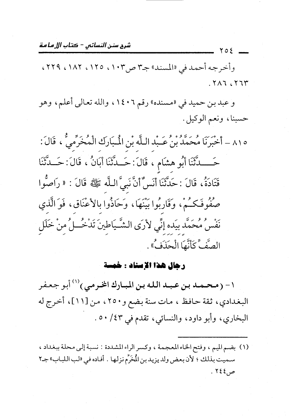 815 - أَخْبَرَنَا مُحَمَّدُ بْنُ عَبْدِ اللَّهِ بْنِ الْمُبَارَكِ الْمُخَرِّمِيُّ، قَالَ: حَدَّثَنَا أَبُو هِشَامٍ، قَالَ: حَدَّثَنَا أَبَانُ، قَالَ: حَدَّثَنَا قَتَادَةُ، قَالَ: حَدَّثَنَا أَنَسٌ أَنَّ نَبِيَّ اللَّهِ -صلى الله عليه وسلم- قَالَ: "رَاصُّوا صُفُوفَكُمْ، وَقَارِبُوا بَيْنَهَا، وَحَاذُوا بِالأَعْنَاقِ، فَوَالَّذِي نَفْسُ مُحَمَّدٍ بِيَدِهِ إِنِّي لأَرَى الشَّيَاطِينَ تَدْخُلُ مِنْ خَلَلِ الصَّفِّ كَأَنَّهَا الْحَذَفُ".