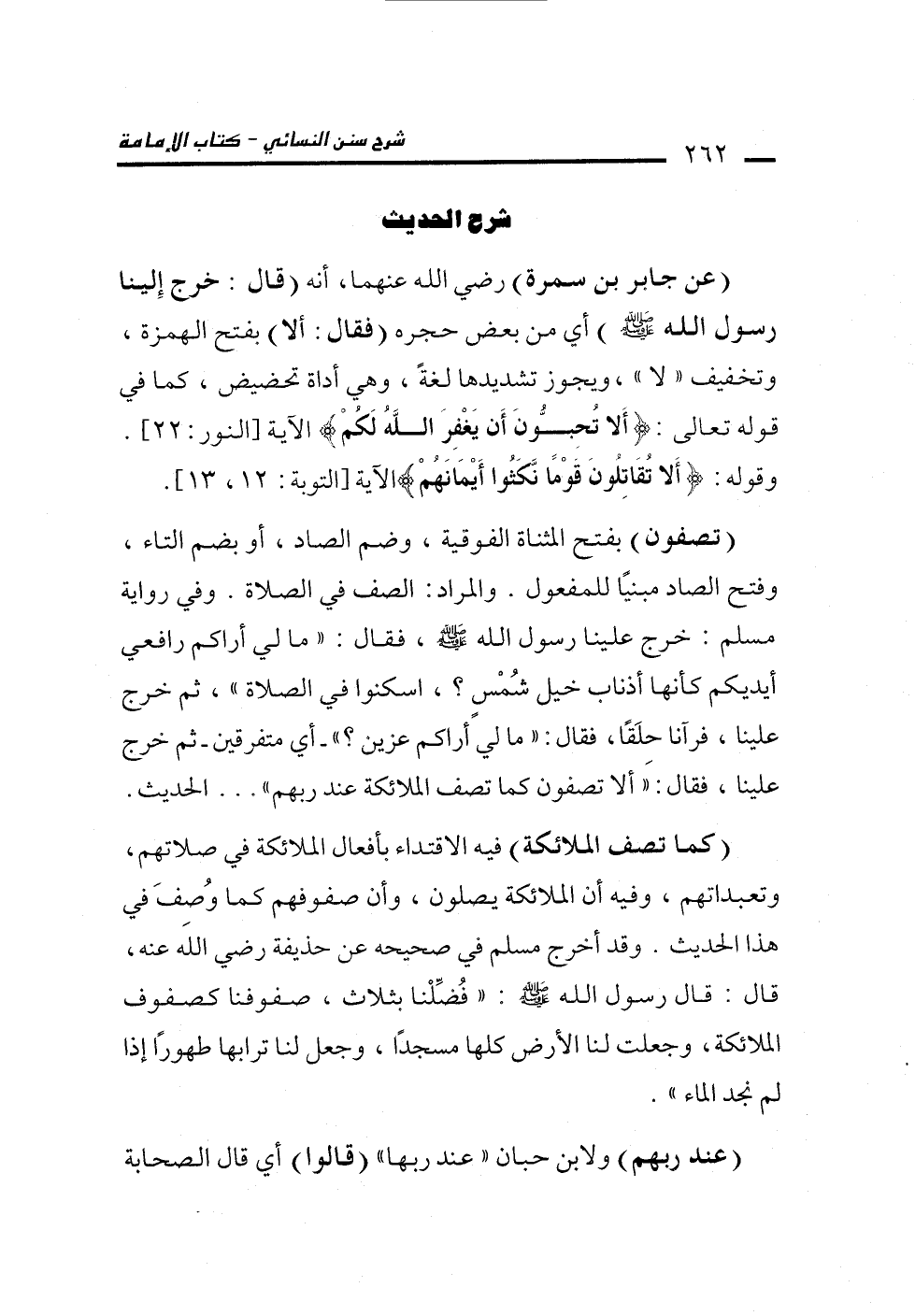 (عن جابر بن سمرة) رضي الله عنهما، أنه (قال: خرج إِلينا رسول الله -صلى الله عليه وسلم-) أي من بعض حجره (فقال: ألا) بفتح الهمزة، وتخفيف "لا"، ويجوز تشديدها لغةً، وهي أداة تحضيض، كما في قوله تعالى: {أَلَا تُحِبُّونَ أَنْ يَغْفِرَ اللَّهُ لَكُمْ} الآية [النور: 22]. وقوله: {أَلَا تُقَاتِلُونَ قَوْمًا نَكَثُوا أَيْمَانَهُمْ} الآية [التوبة: 12، 13].