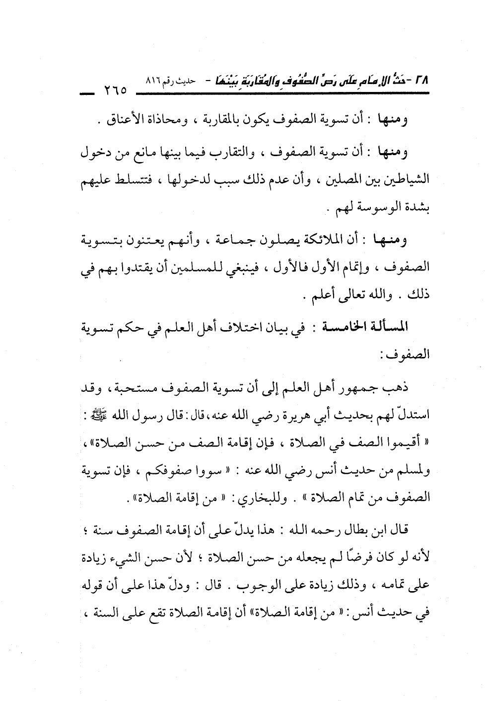 المسألة الخامسة: في بيان اختلاف أهل العلم في حكم تسوية الصفوف: