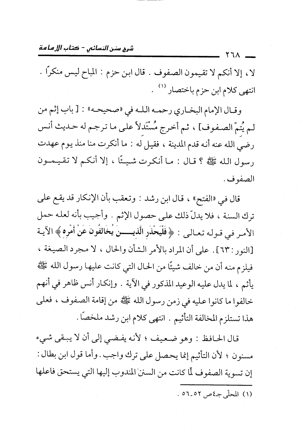 قال في "الفتح"، قال ابن رشد: وتعقب بأن الإنكار قد يقع على ترك السنة، فلا يدلّ ذلك على حصول الإثم. وأجيب بأنه لعله حمل الأمر في قوله تعالى: {فَلْيَحْذَرِ الَّذِينَ يُخَالِفُونَ عَنْ أَمْرِهِ} الآية [النور: 63]. على أن المراد بالأمر الشأن والحال، لا مجرد الصيغة، فيلزم منه أن من خالف شيئًا من الحال التي كانت عليها رسول الله -صلى الله عليه وسلم- يأثم، لما يدل عليه الوعيد المذكور في الآية. وإنكار أنس ظاهر في أنهم خالفوا ما كانوا عليه في زمن رسول الله -صلى الله عليه وسلم- من إقامة الصفوف، فعلى هذا تستلزم المخالفة التأثيم، انتهى كلام ابن رشد ملخصًا.