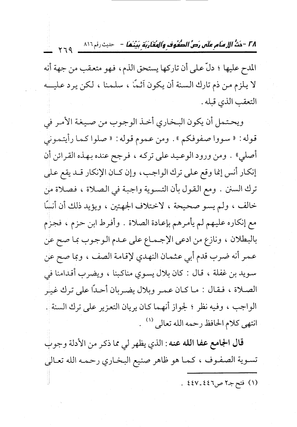 ويحتمل أن يكون البخاري أخذ الوجوب من صيغة الأمر في قوله: "سووا صفوفكم". ومن عموم قوله: "صلوا كما رأيتموني أصلي". ومن ورود الوعيد على تركه، فرجح عنده بهذه القرائن أن إنكار أنس إنما وقع على ترك الواجب، وإن كان الإنكار قد يقع على ترك السنن. ومع القول بأن التسوية واجبة في الصلاة، فصلاة من خالف، ولم يسو صحيحة، لاختلاف الجهتين، ويؤيد ذلك أن أنسًا مع إنكاره عليهم لم يأمرهم بإعادة الصلاة. وأفرط ابن حزم، فجزم بالبطلان، ونازع من ادعى الإجماع على عدم الوجوب بما صح عن عمر أنه ضرب قدم أبي عثمان النهدي لإقامة الصف، وبما صح عن سويد بن غفلة، قال: كان بلال يسوي مناكبنا، ويضرب أقدامنا في الصلاة، فقال: ما كان عمر وبلال يضربان أحدًا على ترك غير الواجب، وفيه نظر؛ لجواز أنهما كان يريان التعزير على ترك السنة. انتهى كلام الحافظ رحمه الله تعالى (¬1).