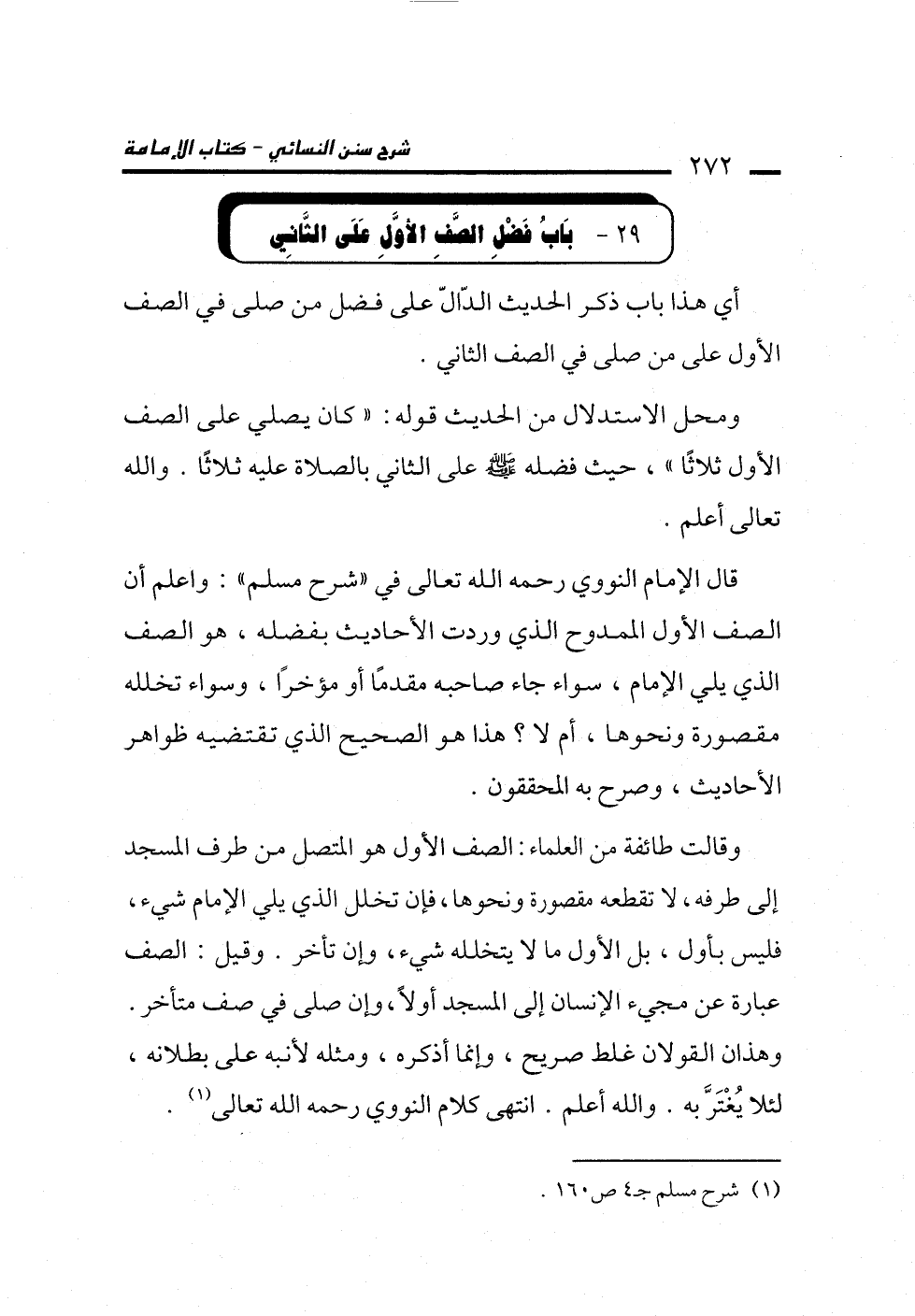 وقالت طائفة من العلماء: الصف الأول هو المتصل من طرف المسجد إلى طرفه، لا تقطعه مقصووة ونحوها، فإن تخلل الذي يلي الإمام شيء، فليس بأول، بل الأول ما لا يتخلله شيء، وإن تأخر. وقيل: الصف عبارة عن مجيء الإنسان إلى المسجد أولاً، وإن صلى في صف متأخر. وهذان القولان غلط صريح، وإنما أذكره، ومثله لأنبه على بطلانه، لئلا يُغْتَرَّ به. والله أعلم. انتهى كلام النووى رحمه الله تعالى (¬1).