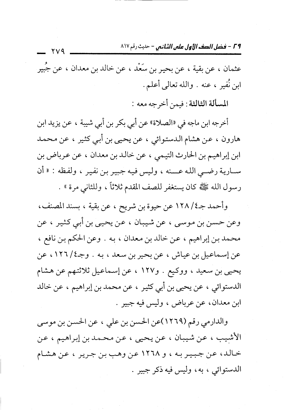 أخرجه ابن ماجه في "الصلاة" عن أبي بكر بن أبي شيبة، عن يزيد ابن هارون، عن هشام الدستوائي، عن يحيى بن أبي كثير، عن محمد بن إبراهيم بن الحارث التيمي، عن خالد بن معدان، عن عرباض بن سارية رضي الله عنه، وليس فيه جبير بن نفير، ولفظه: "أن رسول الله -صلى الله عليه وسلم- كان يستغفر للصف المقدم ثلاثاً، وللثاني مرة".
