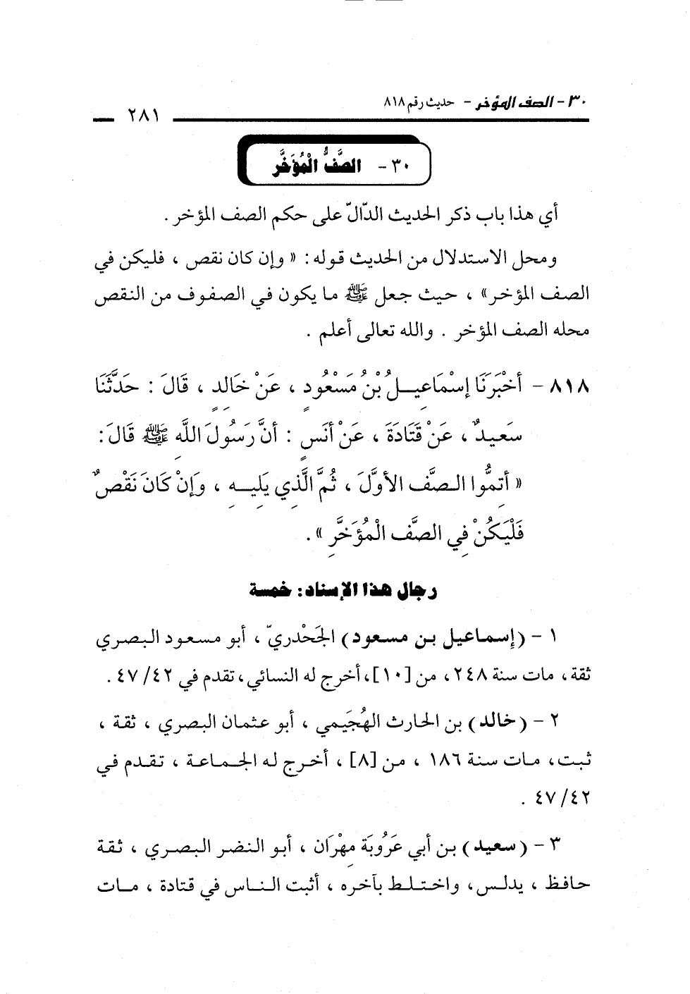 818 - أَخْبَرَنَا إِسْمَاعِيلُ بْنُ مَسْعُودٍ، عَنْ خَالِدٍ، قَالَ: حَدَّثَنَا سَعِيدٌ، عَنْ قَتَادَةَ، عَنْ أَنَسٍ: أَنَّ رَسُولَ اللَّهِ -صلى الله عليه وسلم- قَالَ: "أَتِمُّوا الصَّفَّ الأَوَّلَ، ثُمَّ الَّذِي يَلِيهِ، وَإِنْ كَانَ نَقْصٌ فَلْيَكُنْ فِي الصَّفِّ الْمُؤَخَّرِ".
